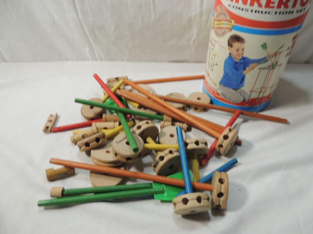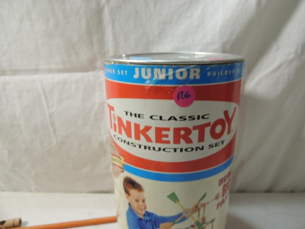 A CLASSIC SINCE 1913 ORGINAL VINTAGE TINKER TOYS. BUILDER SET. IN ORGINAL CANISTER. AS SHOWN SEE PHOTO FOR MORE DETAILS.