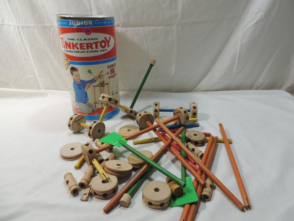 A CLASSIC SINCE 1913 ORGINAL VINTAGE TINKER TOYS. BUILDER SET. IN ORGINAL CANISTER. AS SHOWN SEE PHOTO FOR MORE DETAILS.