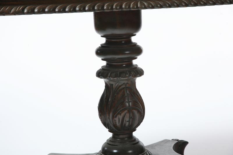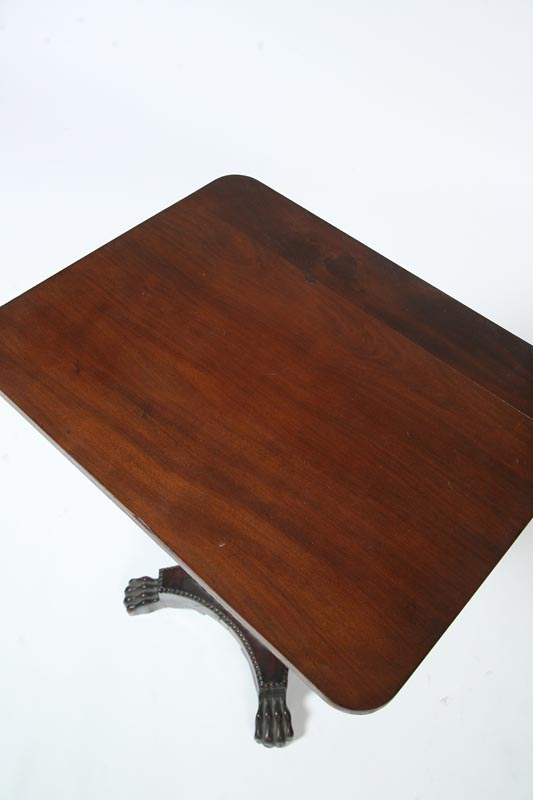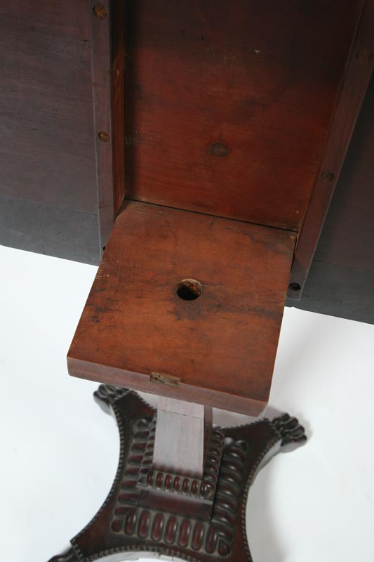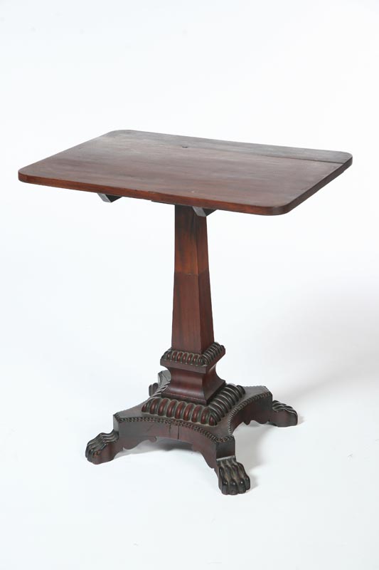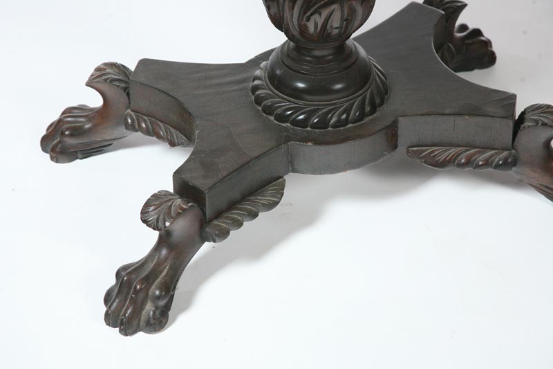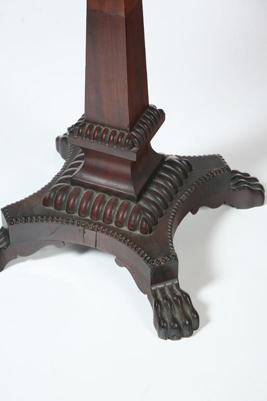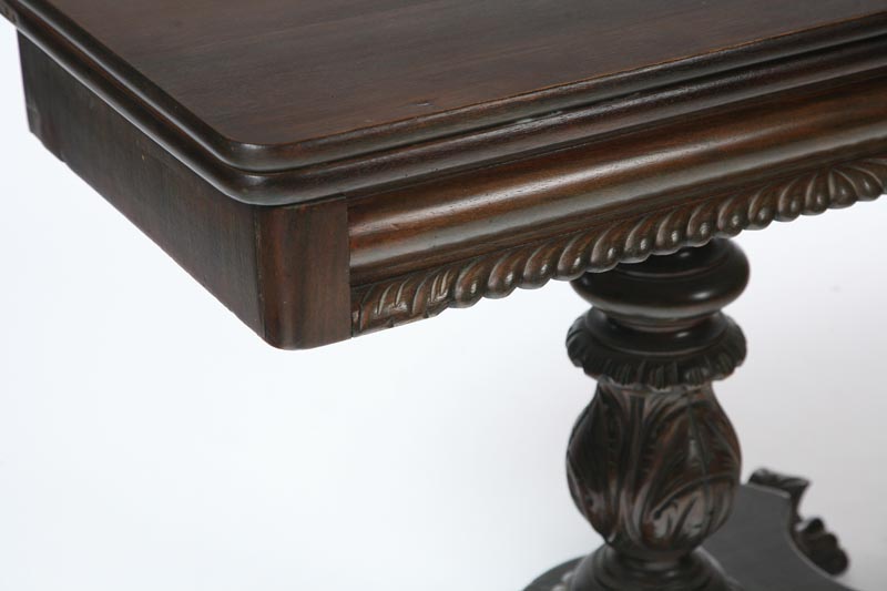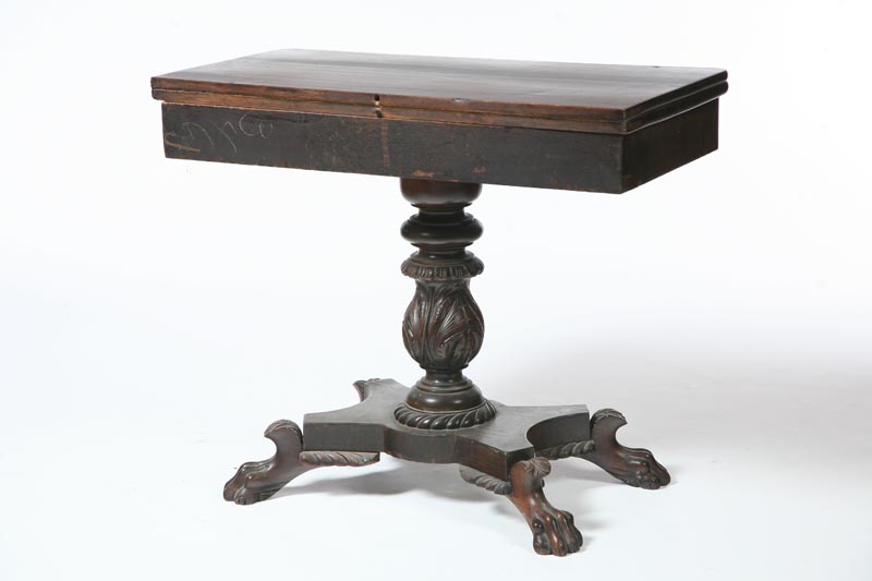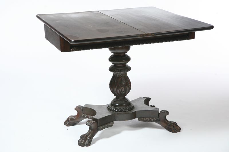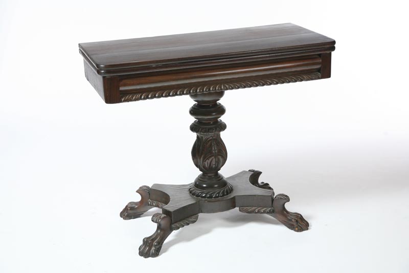 American, mid 19th century, mahogany. Carved table with paw feet and gadrooning. The card table has an acanthus carved pedestal base while the stand has a tapered pedestal. Some imperfections. Table, 30"h. 36"w. 17 1/4" leaves (34 1/2"d. open). Stand, 27"h. 24"w. 19"d.