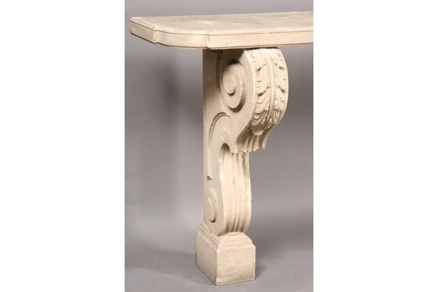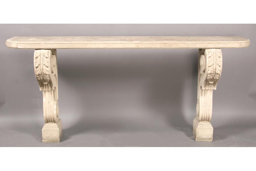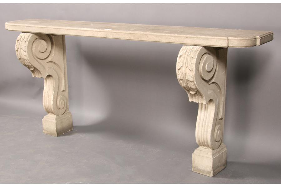 A good classical cast stone garden console table with shaped and molded top supported on scrolling acanthus and fluted legs circa 1940. Ht: 35.5" Width: 79" Depth: 16" ***PLEASE NOTE: All property shall be paid for by the purchaser within five (5) business days of the sale. Kamelot Auctions accepts cash (In house only), personal checks, certified checks and money orders. We do not accept credit cards or Paypal under any circumstances. Please note our policy regarding payments from International buyers: The only acceptable method of payment is a bank wire/bank transfer. For invoices more than $1000, there is no additional fee for this service. For invoices less than $1000, please include an additional $25 wire fee. We will be happy to forward our bank wiring information after the completion of the auction. Thank you for your understanding and cooperation. All purchases must be removed within 15 business days after an auction. Property not removed from our facility after 15 business days will be moved to an off-site storage facility at a charge of $10.00 per day payable by the buyer. Kamelot does NOT provide shipping services or estimates. However, we recommend the following independent shipping services: Antique Transport Co. at antiquetransport@cs.com, Farren Transport at farrentransport@comcast.net or All Points Shipping at jb@allpointsshippingnj.com for quotations and shipping arrangements for furniture and other large items that would require a blanket wrap shipping company. For quotations and shipping arrangements for smaller items that would traditionally be shipped through UPS, please contact The UPS Store at store4744@theupsstore.com or The Packaging Store at hrpa112@aol.com. Clients are welcome to pick up their items from our location or make their own shipping arrangements.