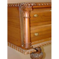 CLASSICAL EMPIRE 2 DRAWER WALNUT STAND. Has ornately carved claw feet & pedestal. Decorated with rope trim around top and bottom. Columns on side of drawers. Drawers are dovetailed. Missing brass escutcheon on bottom drawer. Good overall condition. 31.5" H, 24.5" W, 18" D