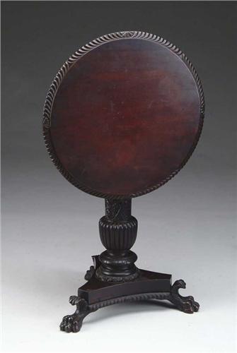CLASSICAL MAHOGANY CARVED CENTER TABLE. Circular tilting top with gadroon carved and molded edge. Turned and carved pedestal resting on a tri formed base, ending in wing carved claw feet. Possibly by or in the manor of Anthony Quevelle. SIZE: 28-1/2” h x 23-3/4” dia. CONDITION: Very good. 9-27943