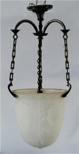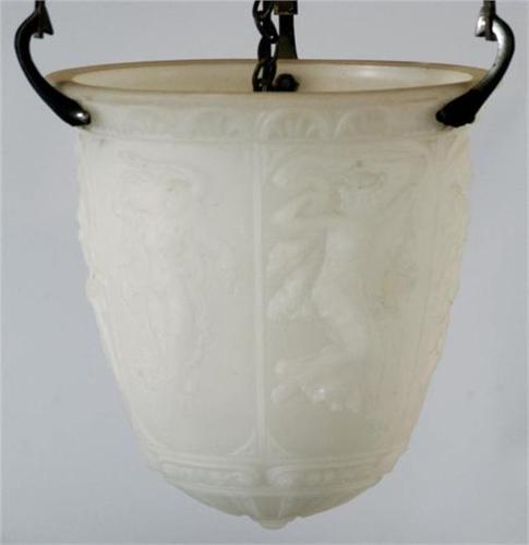 CLASSICAL REVIVAL ALABASTER HALL LIGHT 11 1/2" diameter, shade 28" high, circa 1920 with dancing classical figures, CONDITION: various small chips, a couple 1/4" fracture lines, wiring need replacing, PACKING AND SHIPPING BY FAIRFIELD AUCTION WITHIN CONTINENTAL USA (excluding insurance) $80,