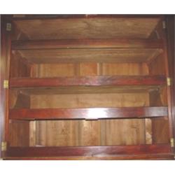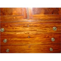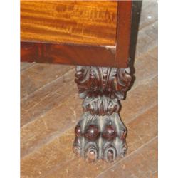 CLASSICAL WALNUT LINEN PRESS with claw feet with 4 dovetailed drawers on bottom and two doors on top. Measures 90" tall, 48" wide, 52 1/2" wide at top, 21 1/2" deep. Retains original brasses but lacks keyhole covers. One strip of wood lacking at rear measuring 20" long. Some losses to veneer and the first two inches of one foot missing. Probably from Baltimore or New York.