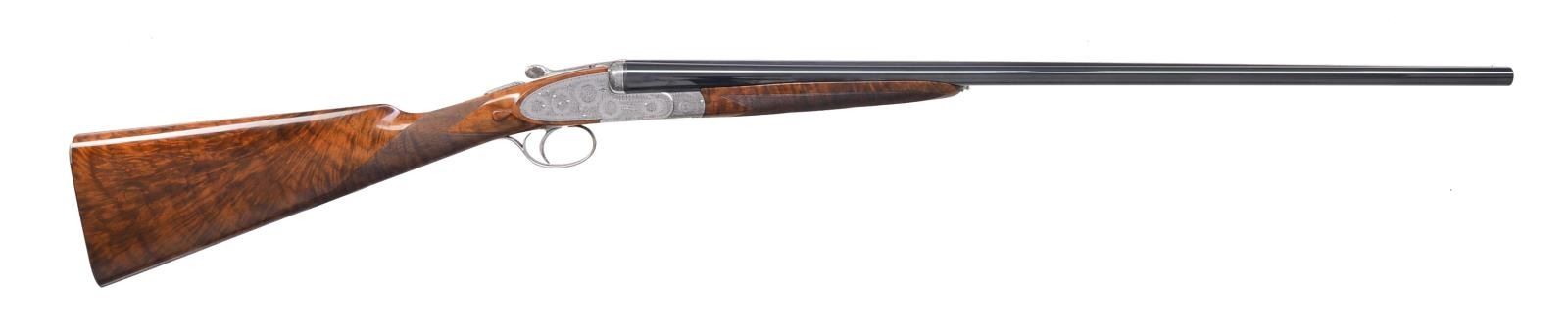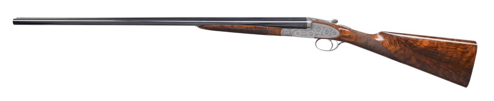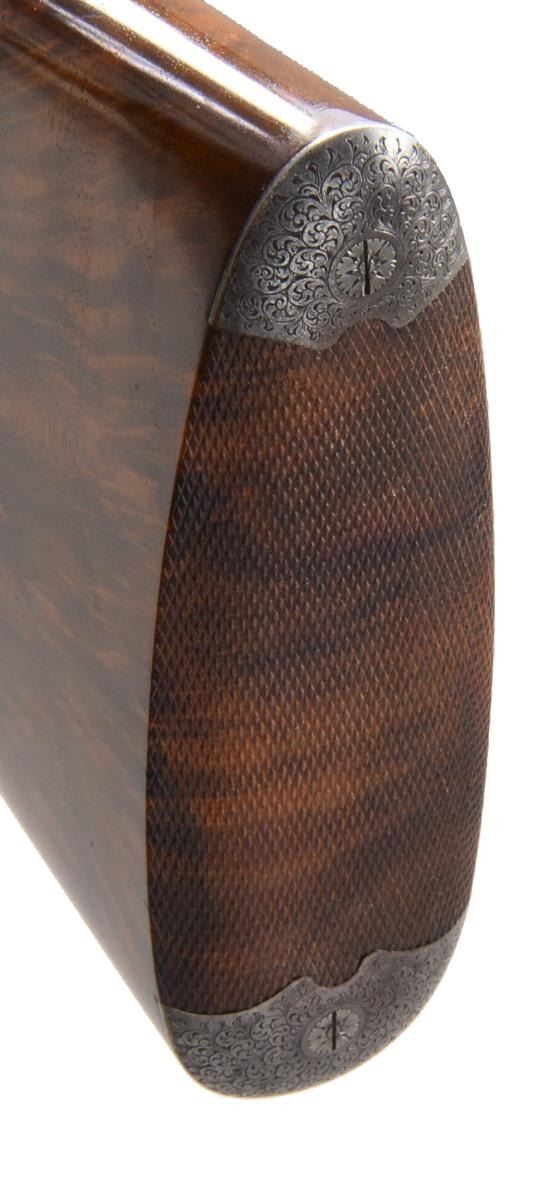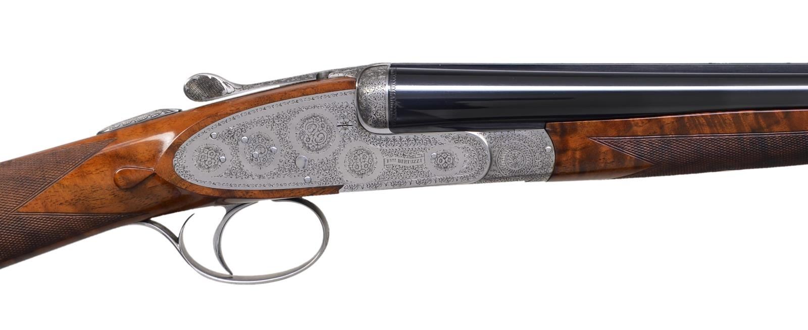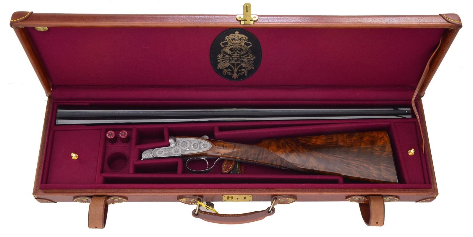 SINGLE TRIGGER GAME SHOTGUN BY F.lli BERTUZZI WITH SCROLL & BULINO ENGRAVING BY G. FERRAGLIO WITH CASE. Cal. 28 Ga. S# 6145. Bbl. 28". The Bertuzzi brothers have long since retired & examples of their limited production of guns, ranking among the world's finest, seldom come to market. This fine small bore example has 28" well struck chopper lump barrels with slightly raised concave matted rib. Top of left barrel is engraved "Filli BERTUZZI ITALY". Barrel flats are stamped with 2007 Italian nitro proofs for 2 3/4" chambers & with importer's name & address (BSANY MILLBROOK). Coin finished, scaled down sidelock action features non automatic safety ("SAFE" inlaid in gold) & single non selective trigger. Action & lockplates are engraved with near full coverage well cut classic rose & scroll. On bottom of action, this scroll surrounds nicely detailed Bulino portrait of woodcock in flight over open meadow. Both lockplates are engraved "Flli BERTUZZI", engraver's signature is on trigger plate. Single beaded trigger guard with matching scroll is gold inlaid with monogram "AR"?. Serial number is on tang. Superb feather crotch figured American walnut straight grip buttstock measures 14 1/2" over checkered wood butt with engraved steel heel toe plates. Well cut point pattern checkering is at grip & matching small semi beavertail ejector forend has Anson release. Uncheckered diamond at bottom is flush gold inlaid with crowned device. MEASUREMENTS: BARRELS: Bore diameter: R .552 L .552 Restriction: R .027 (FULL) L .017 (MOD). STOCK: LOP: 14 1/2". DAC: 1 1/4+". DAH: 2 3/16". Cast: 3/8" off. WEIGHT: 5 lbs. 12 oz. UNATTACHED ACCESSORIES: gun is housed in its original brown pigskin leather case with stitched leather corners by Nizzoli. Interior is lined in burgundy cloth with gold embossed black leather Bertuzzi label stitched into lid. CONDITION: exceptionally fine, close to "as new" with only 1 or 2 of the faintest handling & assembly marks on all wood & metal surfaces. Mechanically crisp. Case is also excellent inside & out. An attractive light weight from the "golden age" of Italian gun making. (20-2503/MGM61). MODERN. $17,500-25,000.