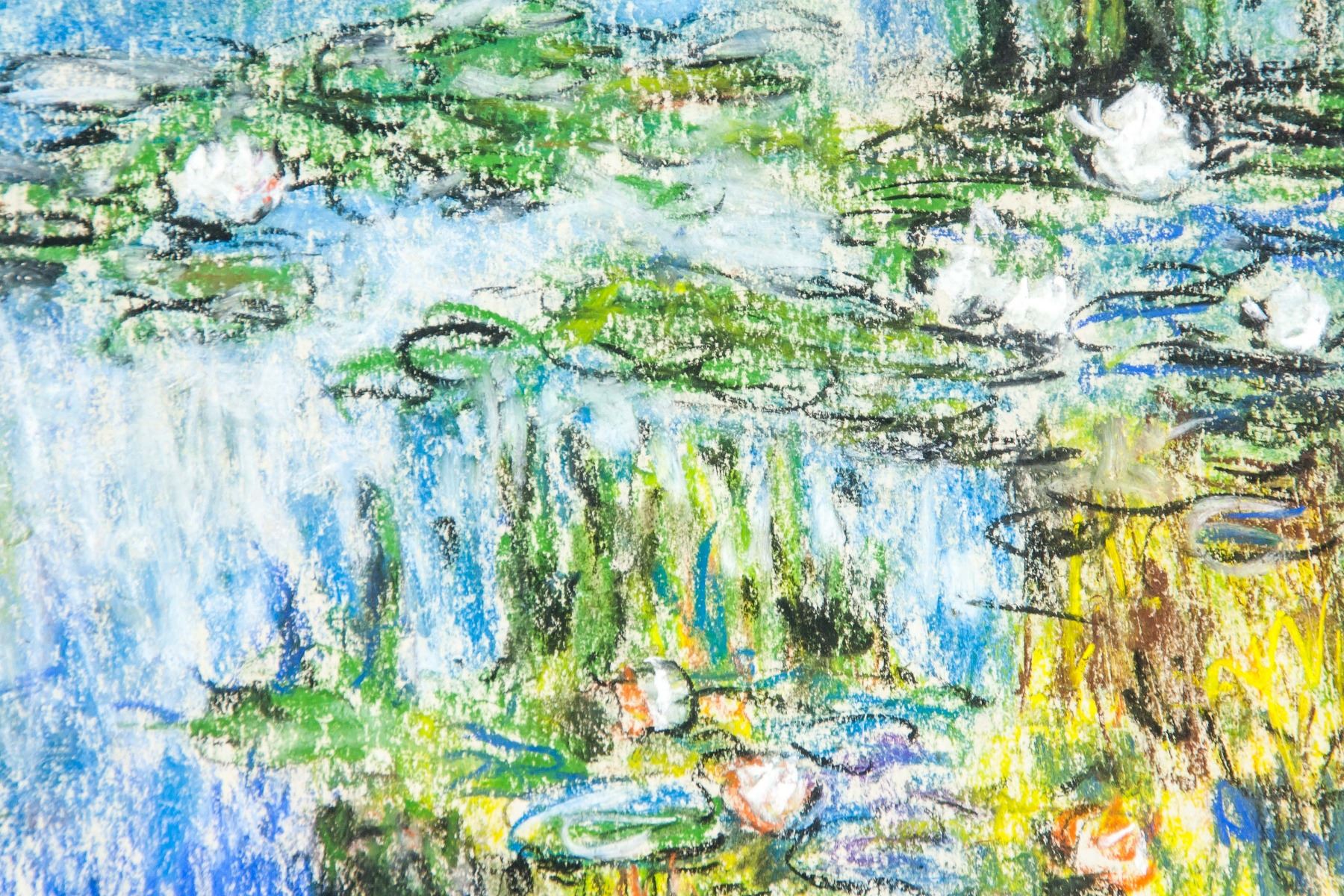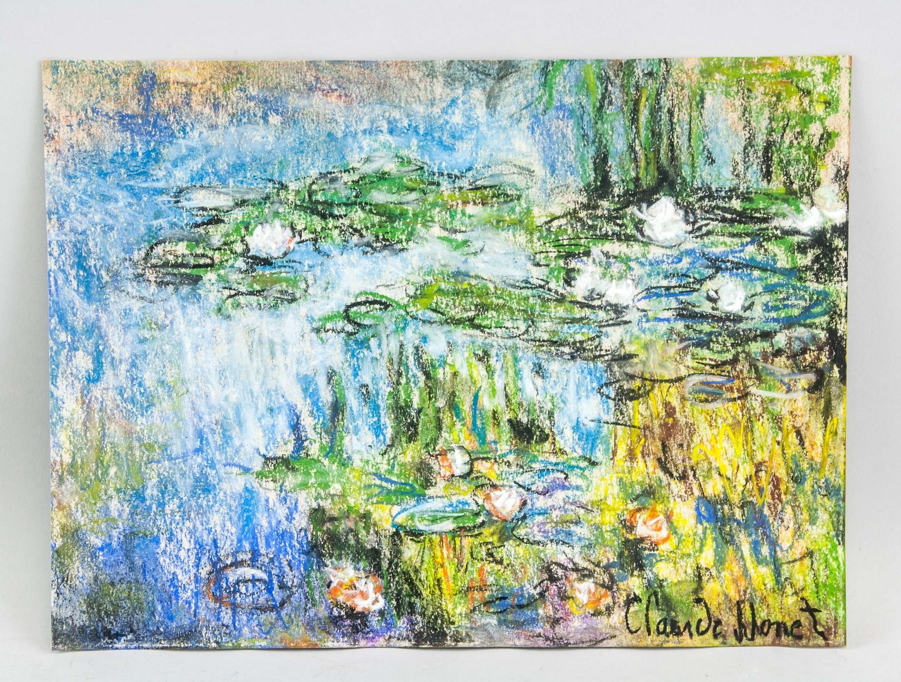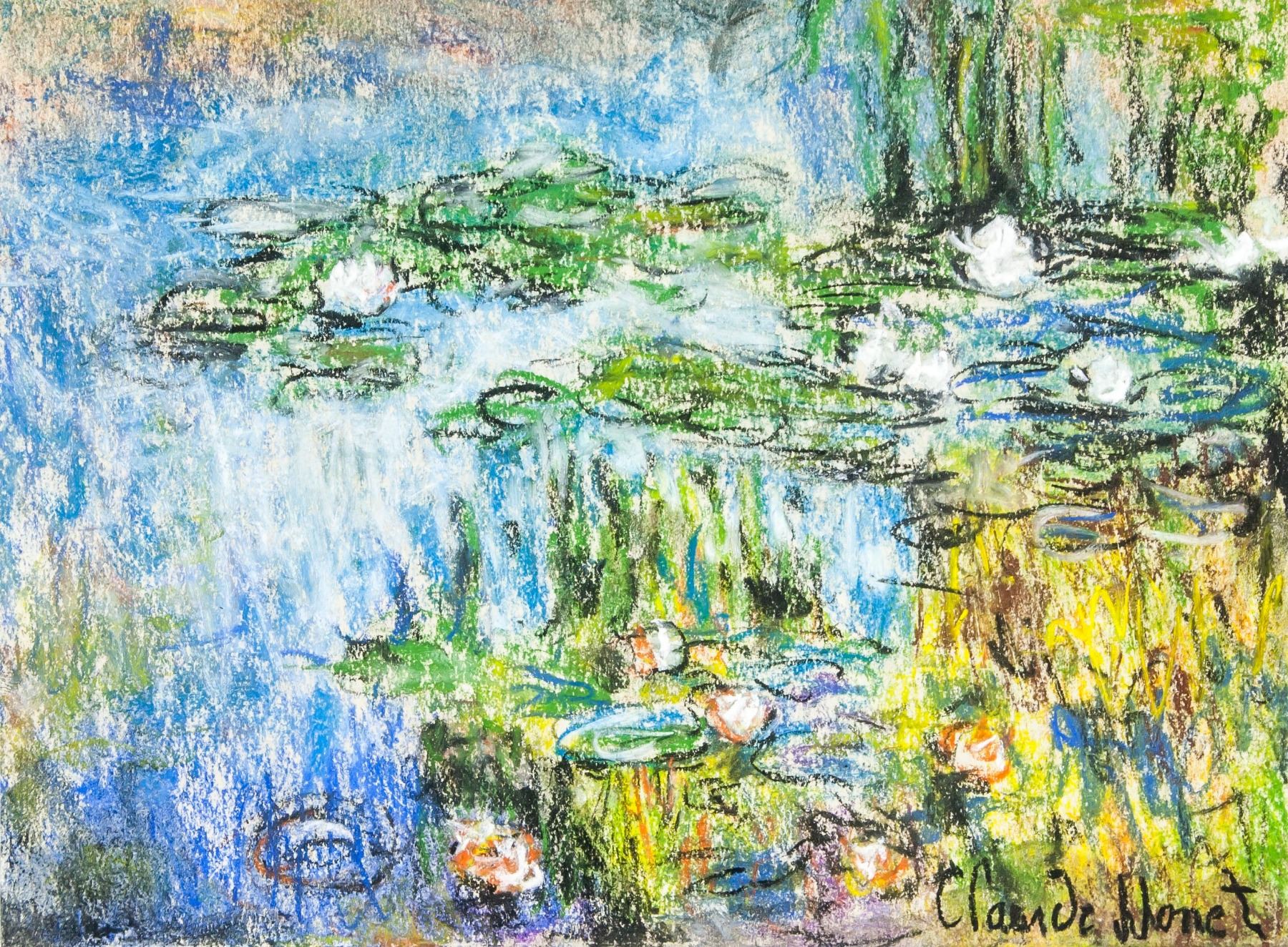 Tempera and pastel on paper. Featuring water lillies. Signed and attr. Claude Monet (French, 1840-1926) with gallery stamp, verso. 7.9 x 10.6 in. (20 x 27 cm). Claude Monet was a French painter known for his pioneering role in the development of Impressionism. A widely beloved artist of the 20th century, his inimitable style is best remembered through his vivid depictions of his flowering garden in Giverny, France, which today serves as a museum dedicated to his life and work. Monet, along with his peers Edgar Degasand Pierre-Auguste Renoir, were concerned with conveying atmosphere and mood with broken brushstrokes and a close attention to the colors of light and shadow. Some of his best known works include Water Lillies (1919), Impression, Sunrise(1872), and Rouen Cathedral at Sunset (1893). “When you go out to paint try to forget what object you have before you—a tree, a house, a field or whatever,” the artist once descried. “Merely think, here is a little square of blue, here an oblong of pink, here a streak of yellow, and paint it just as it looks to you.” Born Oscar-Claude Monet on November 14, 1840 in Paris, France, he learned to plein-air paint as a teenager in the coastal town of Le Havre from an older artist named Eugène Boudin. Returning to Paris in 1859, he was a pupil in the studio of Charles Gleyre, where he met Renoir, Alfred Sisley, and Frédéric Bazille. Their first group show in 1874, caused a public outcry with the art critic Louis Leroy deriding them in print with the term “impressionists.” Over the following decades, public and critical opinion changed towards the Impressionist style, making many of the original members both wealthy and popular. Monet died on December 5, 1926 in Giverny, France at the age of 86. Today, there are around 2,500 surviving works by the artist, some of which are included in the collections of the Hermitage Museum in St. Petersburg, the Musée d’Orsay in Paris, the National Gallery in London, The Museum of Modern Art in New York, and the Rijksmuseum in Amsterdam, among many others. PROVENANCE: Private Collection (Chicago, IL)