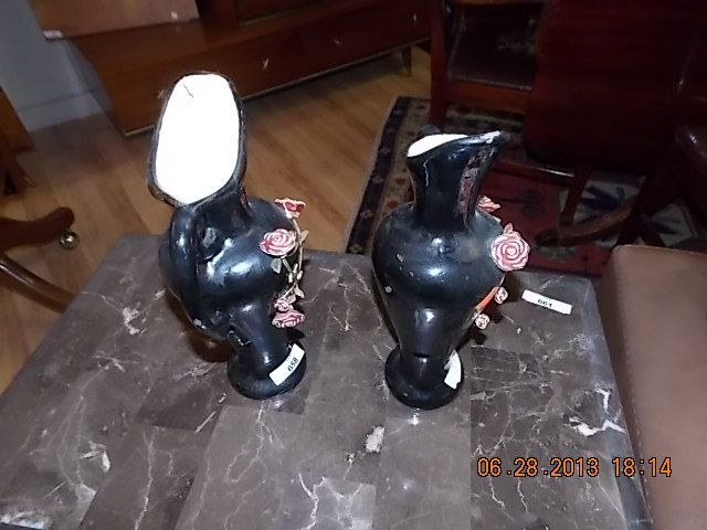 CLAY BLACK JUGS WITH ROSES - 2 TOTAL - MIRROR IMAGES OF EACH OTHER