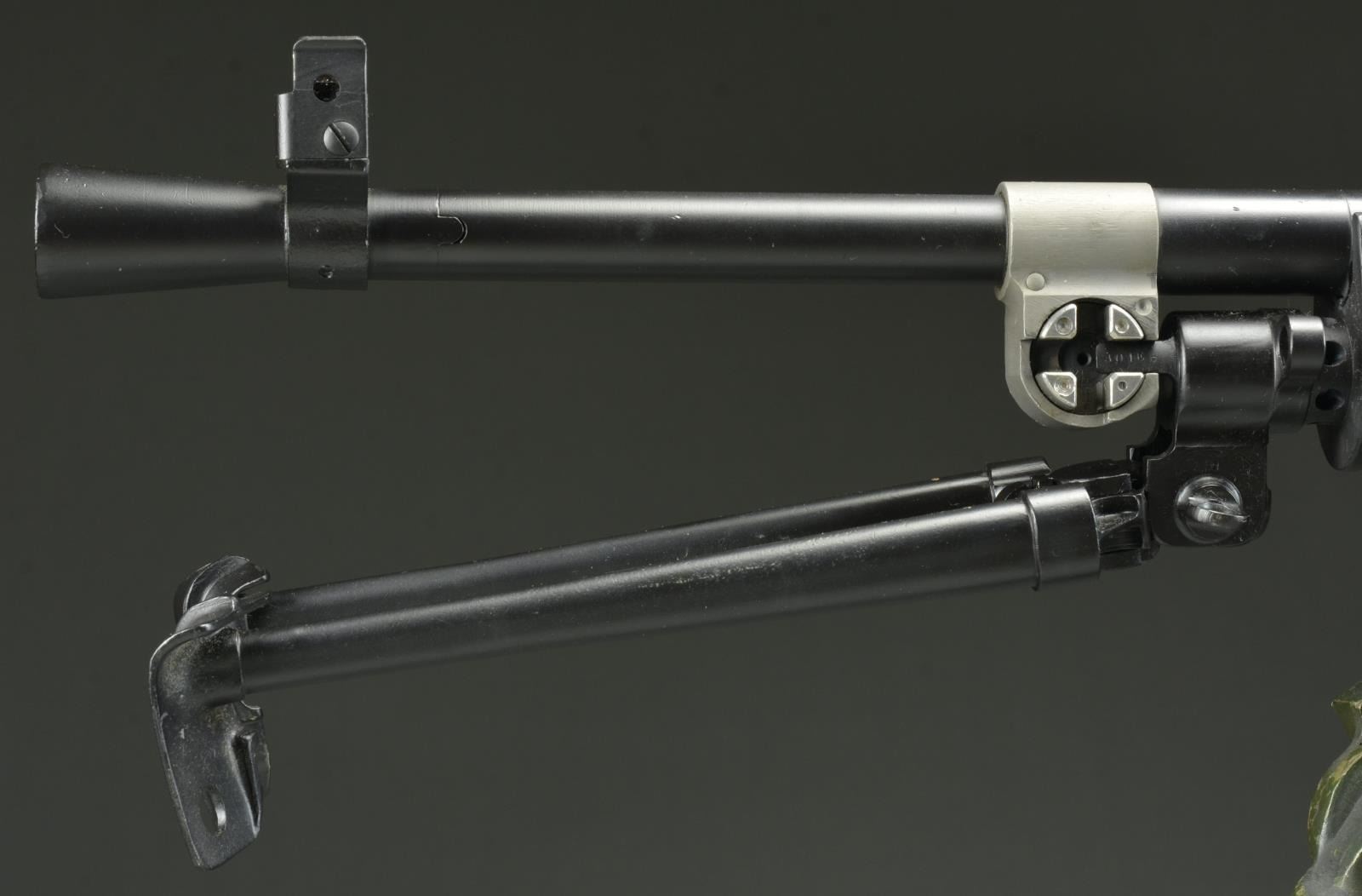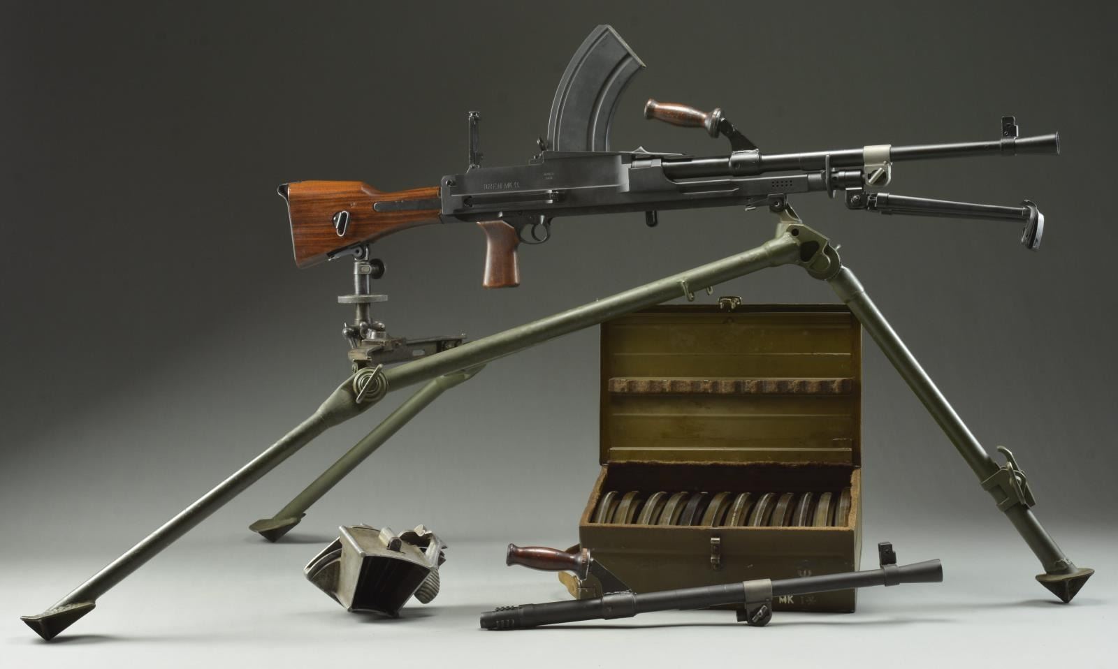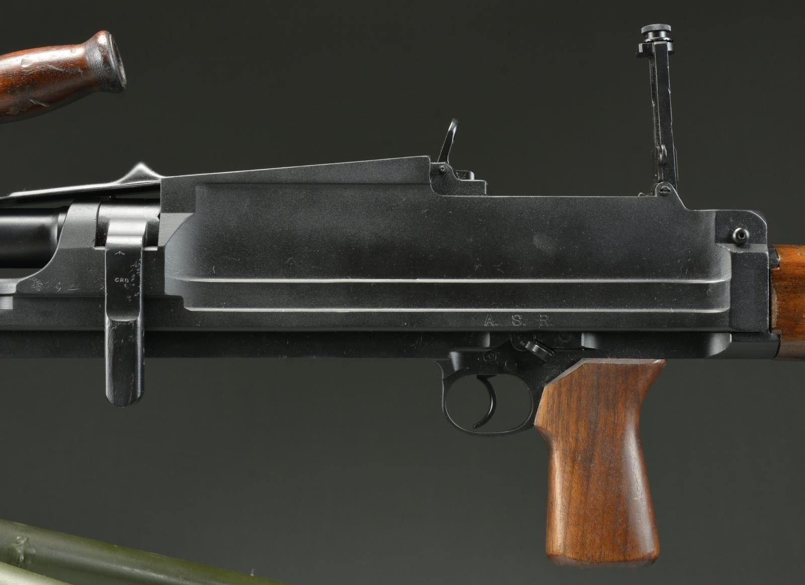 Cal. 303 Brit. S# 7T7097. Semiautomatic Bren MK II that is extremely similar outwardly to the original British MG of WW II fame. Right side of receiver marked, "BREN MKII / INGLISS 1943". Receiver portion below barrel carry handle marked; "KCG RIVERBANK, CA./ MODEL SEMI AUTO BREN / CAL. 303 / 7T7097". Hardwood shoulder stock & pistol grip. Carry handle appears vintage. Right side non-reciprocating charging handle Left side 2 position safety switch which cannot move beyond 90° position in the modified trigger group. Just like the original, the sights are offset to the left side to accommodate aiming with the top, center magazine placement. Front sight is a protected post while the rear sight is a peep, adjustable from 200–1600 meters. Folding bipod that mounts directly rear of the barrel mounted gas block. Sliding dust cover. MAGS: 14 Steel 30rd. UNATTACHED ACCESSORIES: Aluminum mag loader, Bren magazine box, for 12 mags, marked "BREN MAGAZINES BREN .303 MKI*", spare barrel, Bren LMG tripod. CONDITION: Dark black finish on exposed metal surfaces enjoys full coverage w/ no sign of blemishing. Wooden stock has a few light impressions. The quick change barrels glide in and out with ease. 12 magazines in mag box coated in varrying degrees of oil / cosmoline. Both barrels have clean bores w/ very strong rifling. (22-3935/JZ). MODERN. $3000-5000.