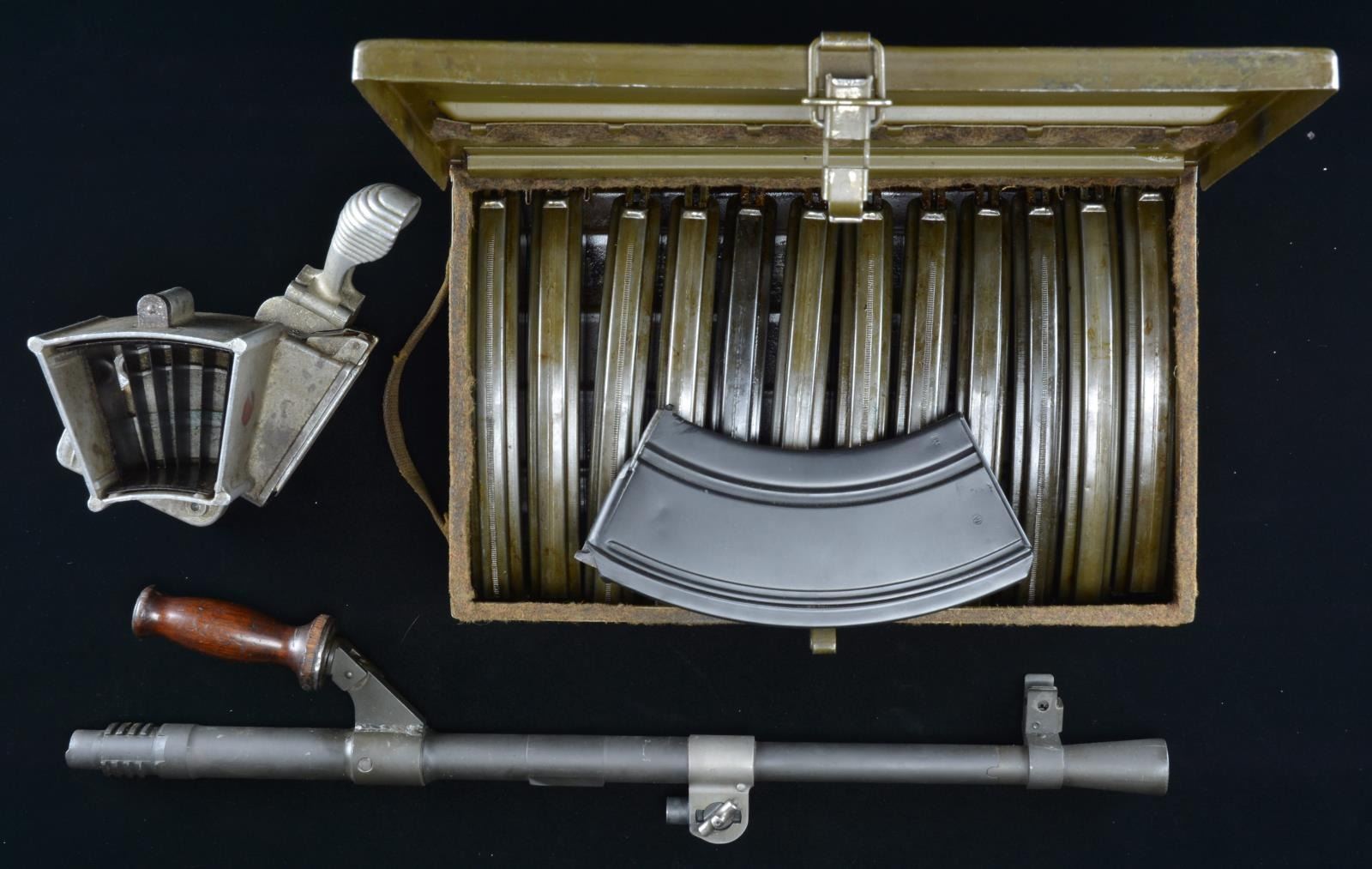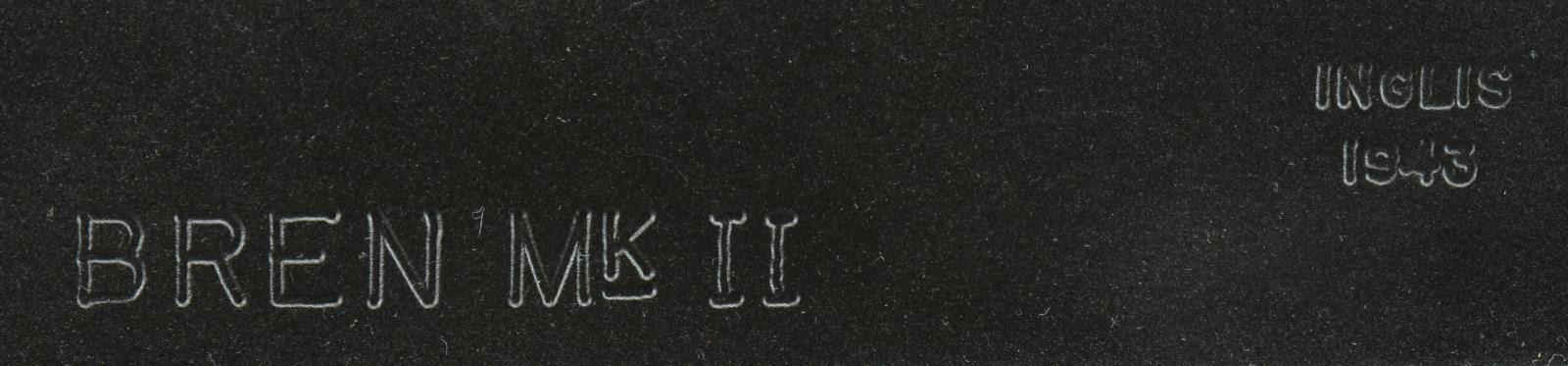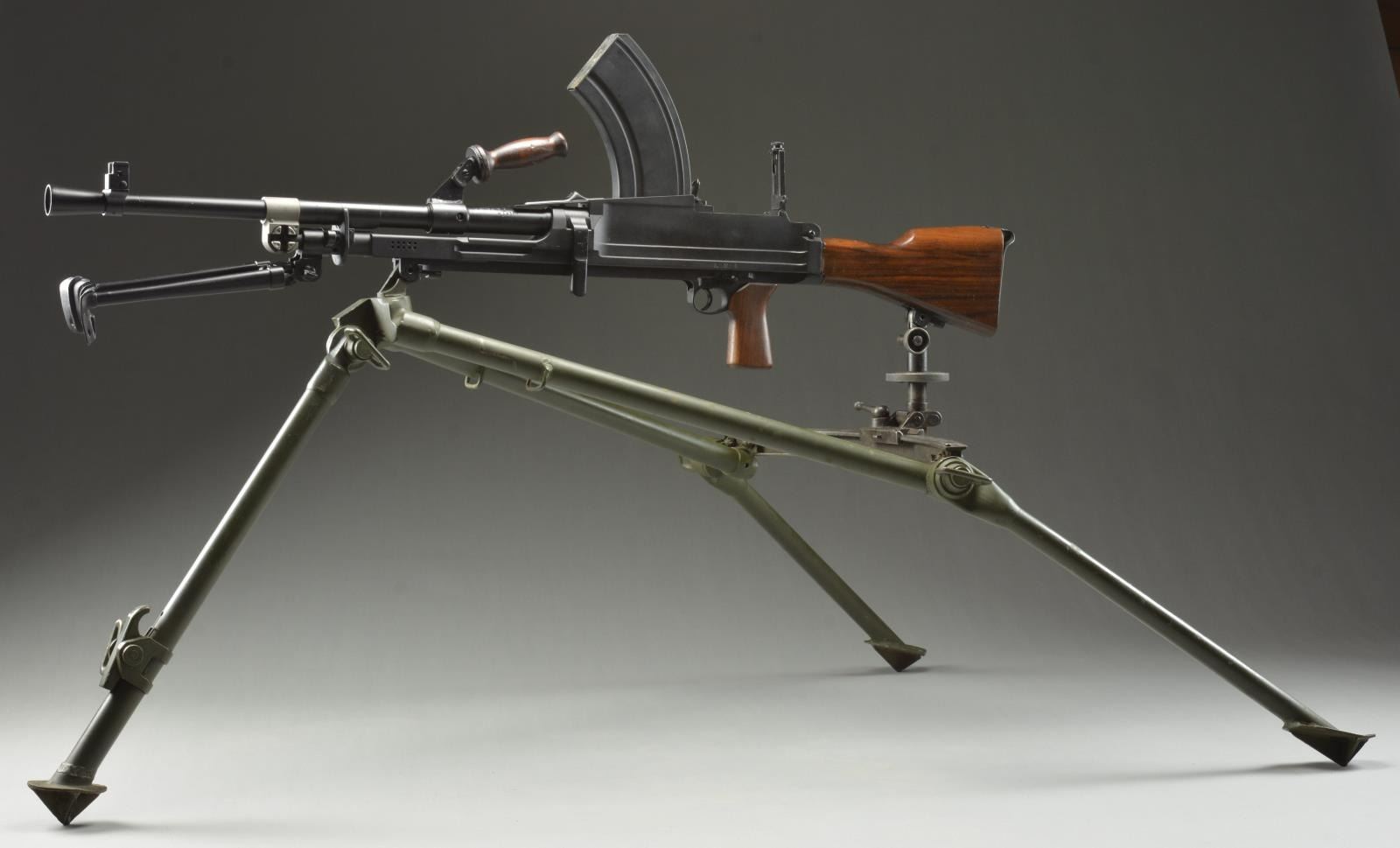 Cal. 303 Brit. S# 7T7097. Semiautomatic Bren MK II that is extremely similar outwardly to the original British MG of WW II fame. Right side of receiver marked, "BREN MKII / INGLISS 1943". Receiver portion below barrel carry handle marked; "KCG RIVERBANK, CA./ MODEL SEMI AUTO BREN / CAL. 303 / 7T7097". Hardwood shoulder stock & pistol grip. Carry handle appears vintage. Right side non-reciprocating charging handle Left side 2 position safety switch which cannot move beyond 90° position in the modified trigger group. Just like the original, the sights are offset to the left side to accommodate aiming with the top, center magazine placement. Front sight is a protected post while the rear sight is a peep, adjustable from 200–1600 meters. Folding bipod that mounts directly rear of the barrel mounted gas block. Sliding dust cover. MAGS: 14 Steel 30rd. UNATTACHED ACCESSORIES: Aluminum mag loader, Bren magazine box, for 12 mags, marked "BREN MAGAZINES BREN .303 MKI*", spare barrel, Bren LMG tripod. CONDITION: Dark black finish on exposed metal surfaces enjoys full coverage w/ no sign of blemishing. Wooden stock has a few light impressions. The quick change barrels glide in and out with ease. 12 magazines in mag box coated in varrying degrees of oil / cosmoline. Both barrels have clean bores w/ very strong rifling. (22-3935/JZ). MODERN. $3000-5000.