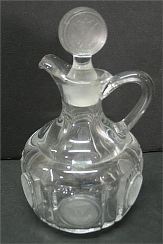 CLEAR COIN GLASS VINEGAR CRUET. Coin glass stopper. Shows wear to the interior of the top from the stopper. 6” H