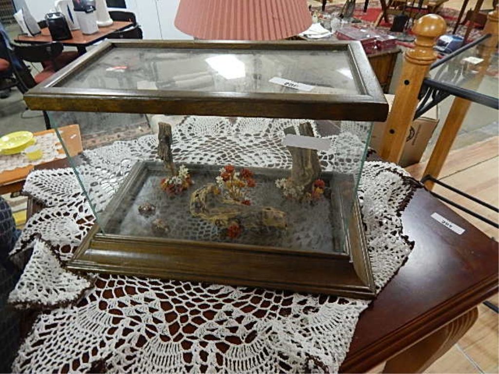 CLEAR DISPLAY CASE WITH WOOD SCENE