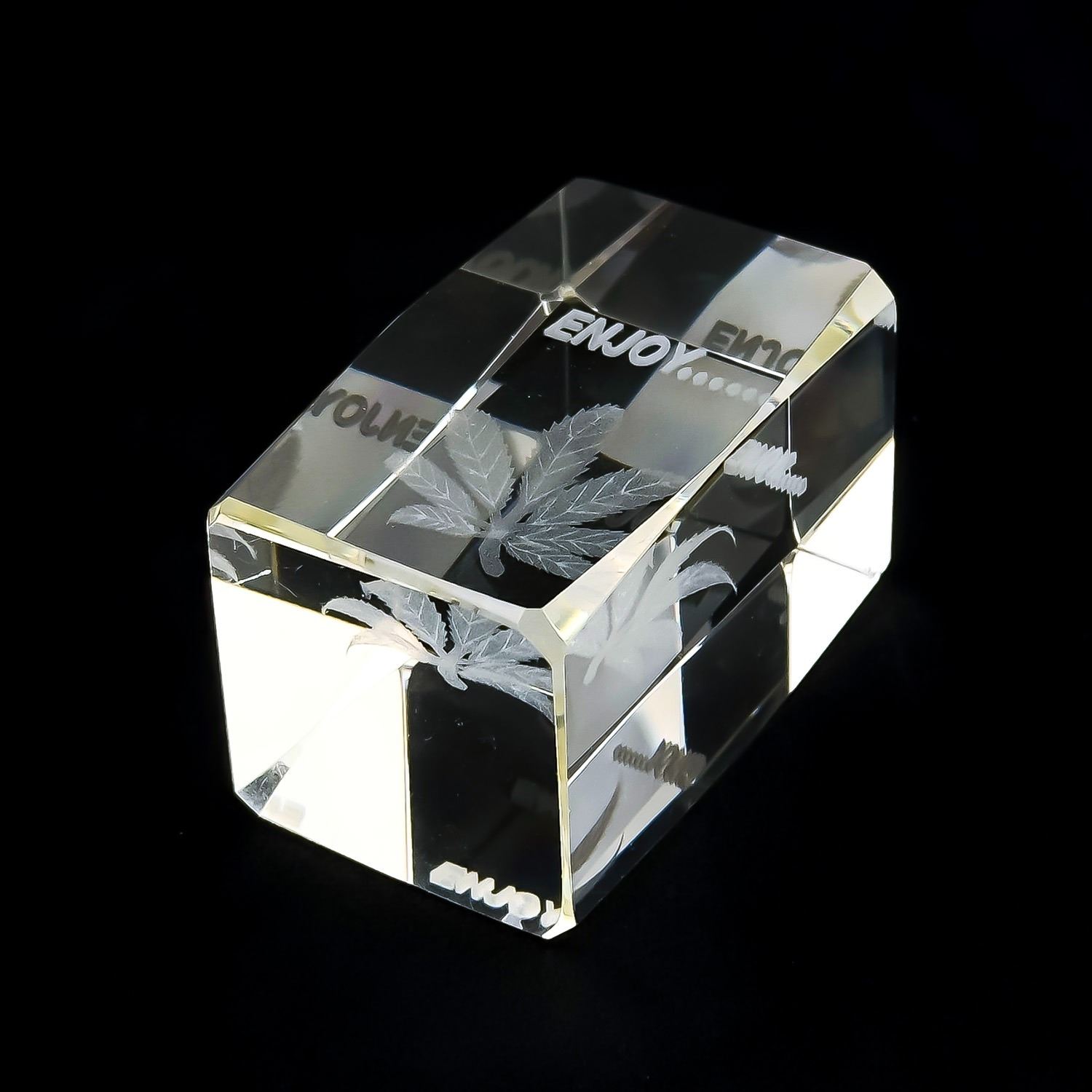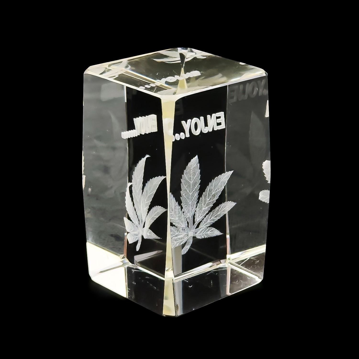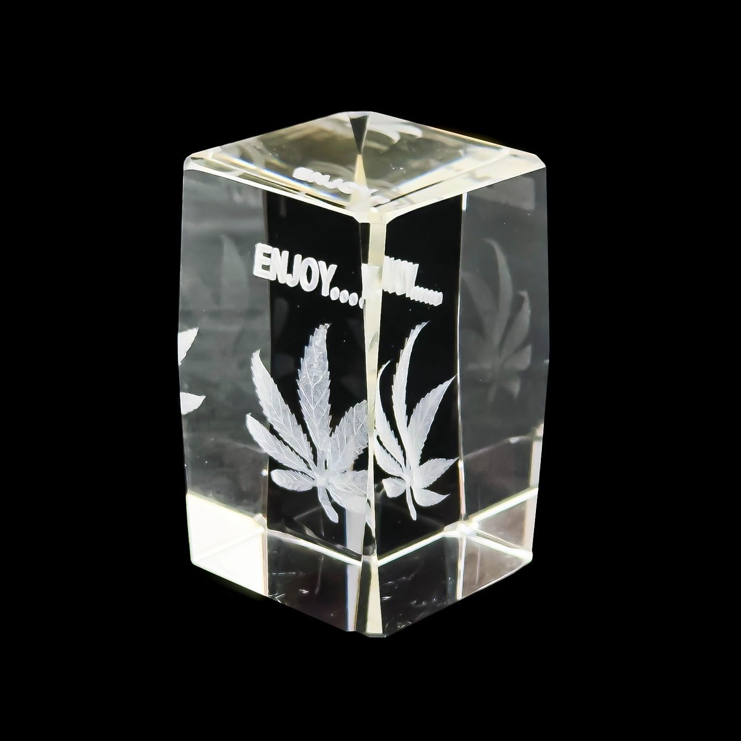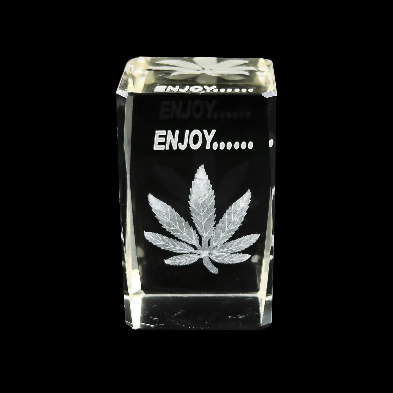 #8048 - CRYSTAL 3-D LASER ETCHED ENGRAVED PAPERWEIGHT SCULPTURE - ENJOY…… WITH CANNABIS POT LEAF IMAGE. HOME OR BAR BARWARE DECOR. MEASURES: 3.125” (8 CM) TALL BY 2” (5 CM) SQUARE