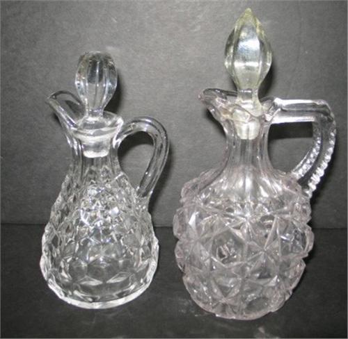PAIR OF CLEAR GLASS VINEGAR CRUETS. Consists of one pressed clear glass cruet with a clear glass stopper that does not match. Cruet shows wear at interior of top from stopper. The other cruet is pressed clear glass with honeycomb design throughout body. It has a clear glass stopper and measures 6.5” H.