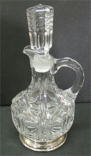 CLEAR GLASS VINEGAR CRUET. Sterling base. Clear glass stopper. Surface wear to interior of top from stopper. 7.25” H