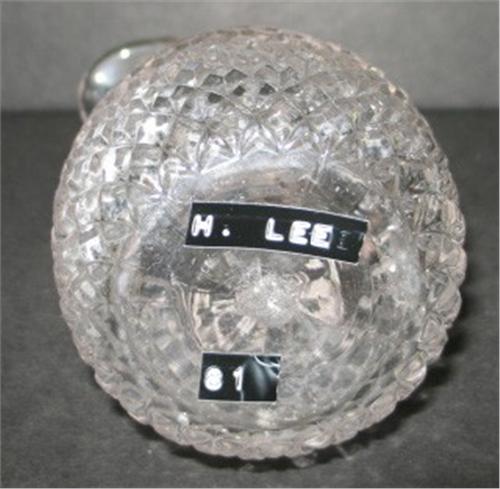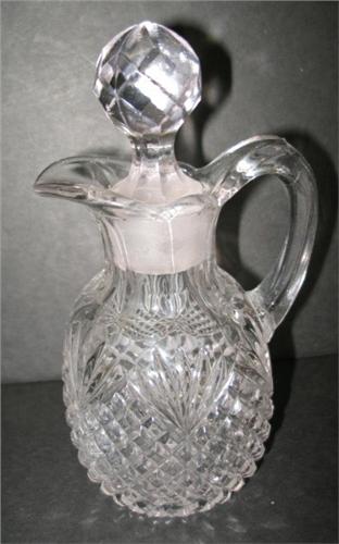 CLEAR GLASS VINEGAR CRUET. Clear glass stopper with prism top. Surface wear to interior of top from stopper. Stopper is damaged at bottom. 7.5” H