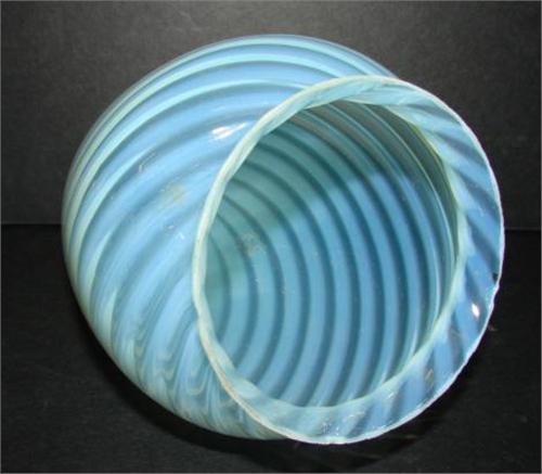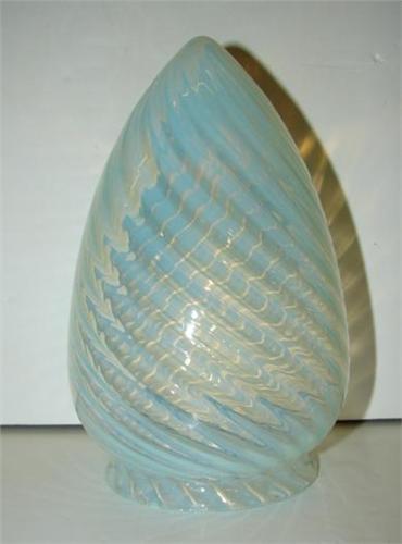 CLEAR OPALESCENT GLASS LAMP SHADE. Conical form with swirl pattern. Shows some roughness and small chipping along bottom edge. 6.5” H, 3.25” Dia. (at bottom).