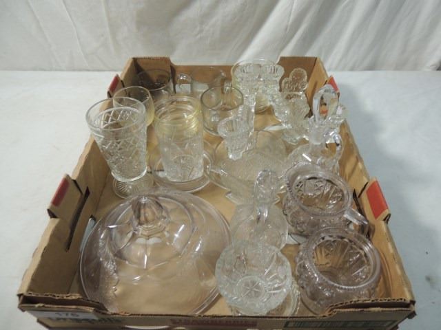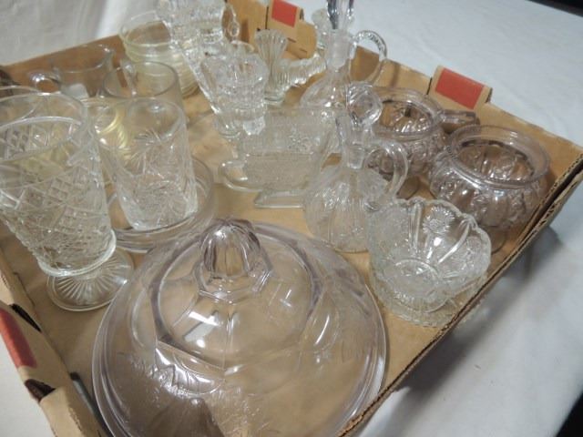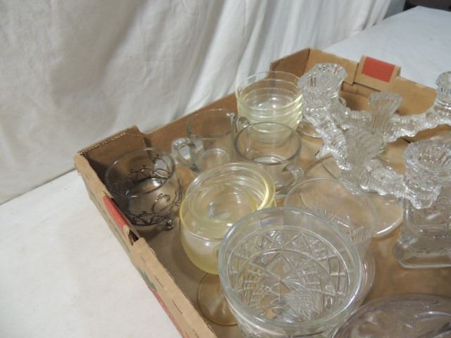 DEPRESSION ERA PRESSED GLASS LOT WITH CRUETS, CANDLE HOLDERS, CREAMERS, SUGARS, AND MORE, AS SHOWN.