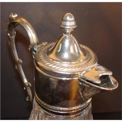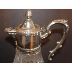 CLEAR GLASS TEAPOT WITH SILVER PLATE TOP. Ornate silver plate top and handle. Studded glass body. 12" H