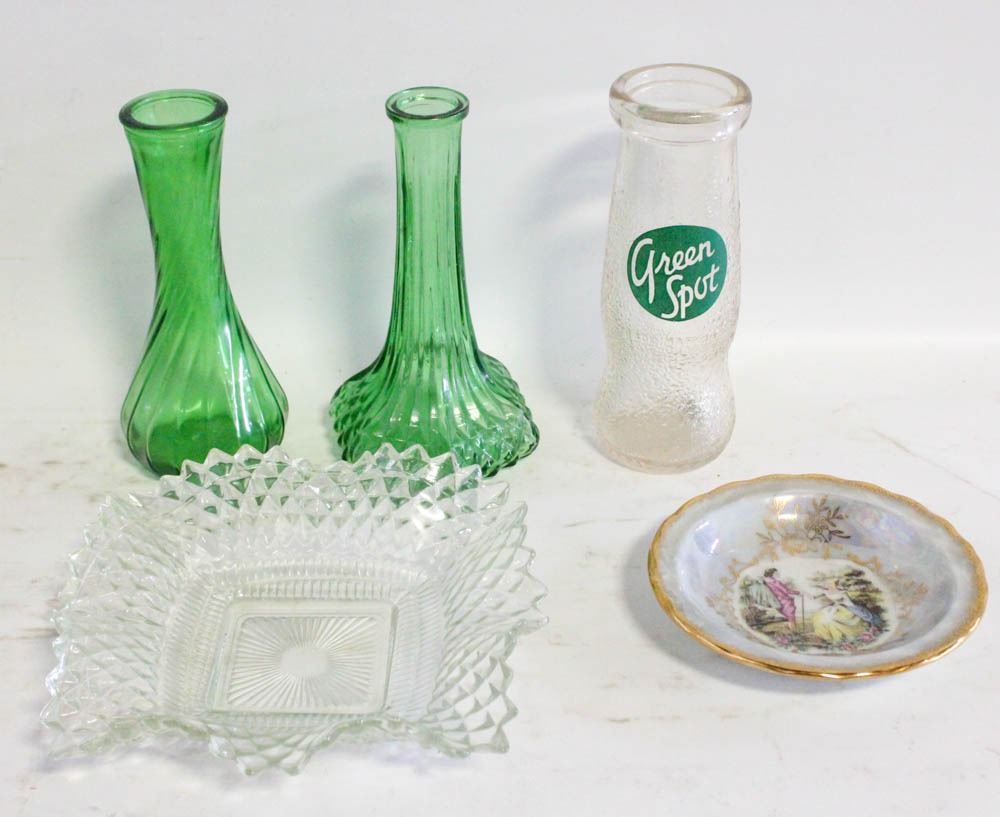 2 VINTAGE GREEN GLASS VASES; 1 OLD DORTMUNDER UNION SPECIAL BEER, 12 OZ., STILL FULL; GREEN SPOT BOTTLE
