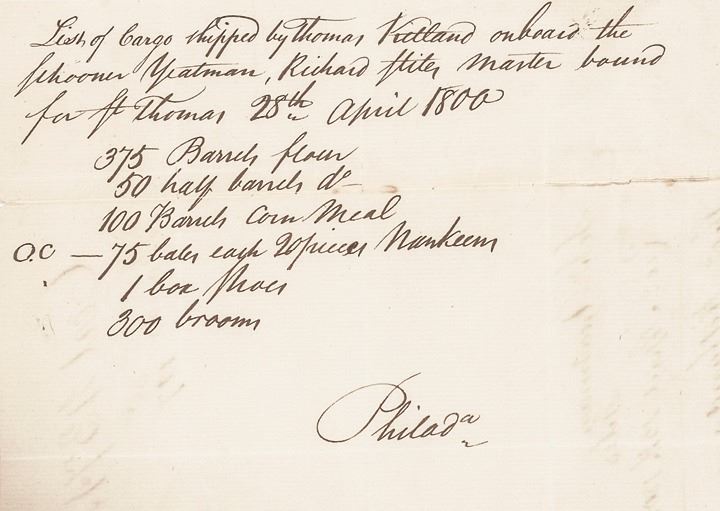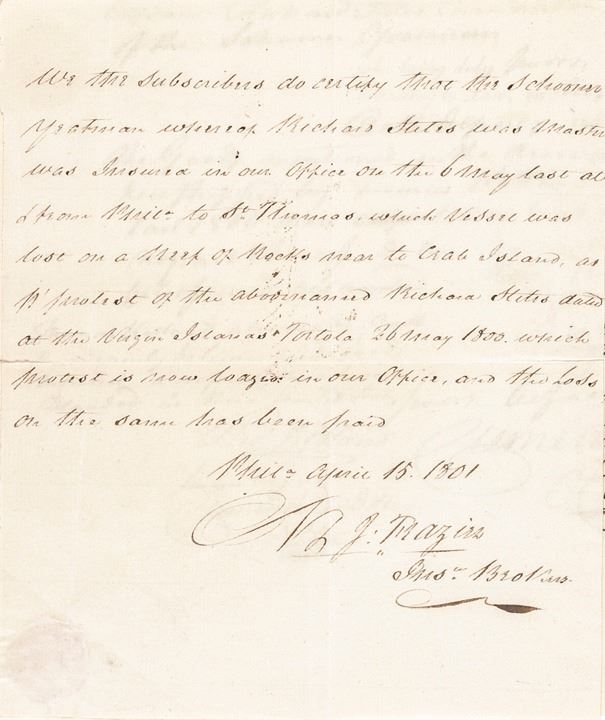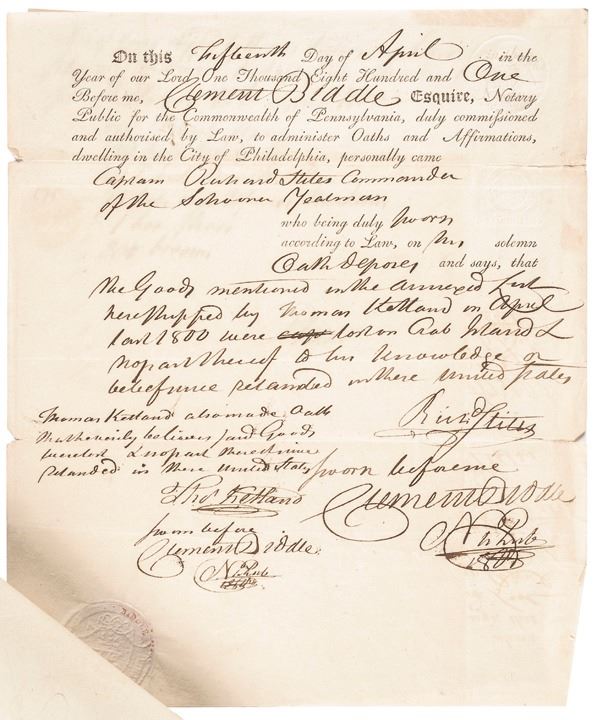 April 15, 1801-Dated Federal Period, Ornate Partially-Printed Document, Signed Three Times, “Clement Biddle,” having 3 pages, Choice Very Fine. This fully executed Document is engrossed and signed three times by Biddle, and includes his embossed notarization of an annexed list of goods shipped from the port and bound for St. Thomas, Virgin Islands, lost in a shipwreck. Weak folds with some edge splits on one portion, boldly written and vividly printed on clean bright period paper. With a choice US 25 Cent Stamp Embossed Revenue sharply impressed at upper right. Highly attractive with nice eye appeal for display. (2 items tied)