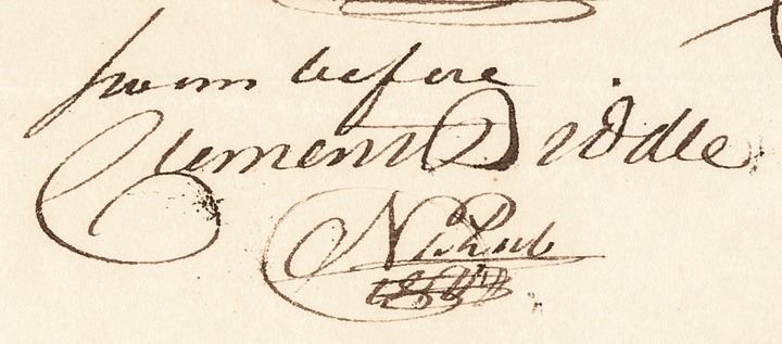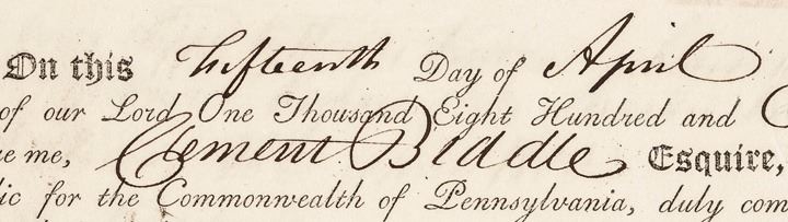 COLONEL CLEMENT BIDDLE (1740-1814). American Revolutionary War Officer, Biddle fought in the Battle of Princeton, Brandywine, Germantown and Monmouth; Continental Army Commissary General at Valley Forge with George Washington; in 1781, Quarter-Master General of the Pennsylvanian troops; appointed the First U.S. Marshal (1789–1793) for Pennsylvania by President George Washington.