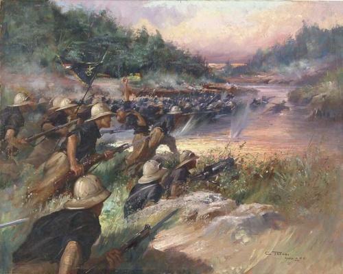 CLEMENTE TAFURI (Italian, 1903-1971) “DAUA PARMA GENNAIO 20 1936”. Unframed oil on canvas battle scene shows a large number of soldiers with pith helmets and guns with bayonets attached forging a river all under a setting sun sky. Several bursts hit water and one man has been hit in chest. Signed lower right “C. Tafuri Roma AXVI”. Titled on back of canvas. SIZE: 23-1/2” x 29-1/2”. CONDITION: Very good. Restretched on new stretcher. 9-27126
