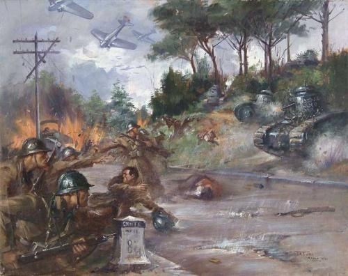 CLEMENTE TAFURI (Italian, 1903-1971) “GUADALAJARA 11-13 MARZO 1937”. Unframed oil on canvas shows an attack from air and land on a truck convoy with soldiers. Four tanks are seen coming out of the woods on top of brown uniformed soldiers. An outstanding action packed canvas with exploding truck, injured men, firing tanks and screaming planes. Signed lower right “C. Tafuri Roma XVI”. Titled on back of canvas. SIZE: 23-1/2” x 29-1/2”. CONDITION: Small canvas patch, very good. Restretched on new stretcher. 9-27127