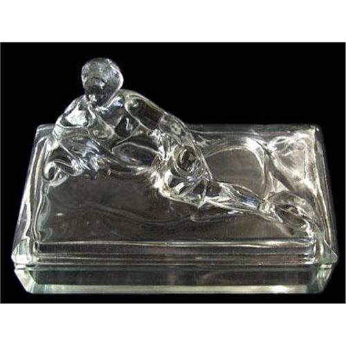 Known as Cleopatra ll this powder jar is shown and described on pages 36-37 of Whitmyer - Bedroom & Bathroom Glassware of the Depression Years. Produced by the American Glass Co., circa 1940, in crystal elegant depression glass and features a classically attired woman [Cleopatra] reclining. The dresser box measures 4 3/4 inches tall by 6 1/2 inches wide by 3 3/8 inches deep and is in excellent condition