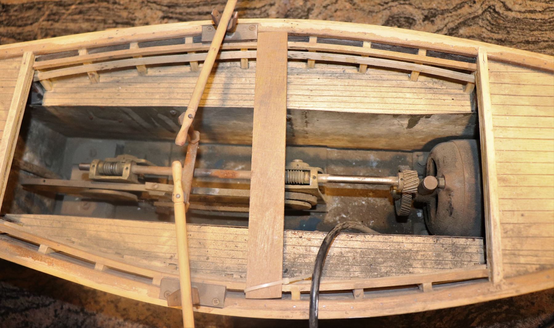 CLEOPATRA EGYPTIAN FUNERAL BARGE BOAT ANTIQUE FILMING MINIATURE W MOTORIEXED ROWING MECHANISM INTACT