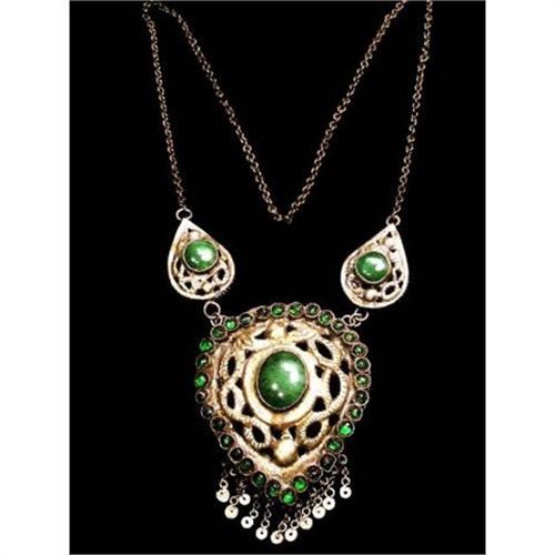 What an exotic and intoxicating beauty this wonderful old double serpent mythological necklace is!! The center pendant has green Czech bezel hand set rhinestones and the other stones are semi precious ( possibly jade). JUST the center pendant is huge ( 3 ½" LONG) and looks as if it came right from an old Victorian garden with these slithering beauties protruding from it. . The silver drops at the bottom move as you do and the large connectors that hold this center piece are also set with what I think is Jade. Gothic and Nouveau all rolled into one FABULOUS old piece!!. This is 22" long and has lots of wonderful old patina!
