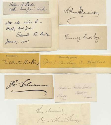 A group of nine signatures on small sheets, mounted. Includes: ELBERT HUBBARD, ALMON GUNNISON, FANNY CROSBY, EDWARD HOWARD GRIGGS, BERTHA C. HUBBARD, ISABELLA BEECHER HOOKER, EDWARD EVERETT HALE (2) and one other not identified. Mounting traces, very good.