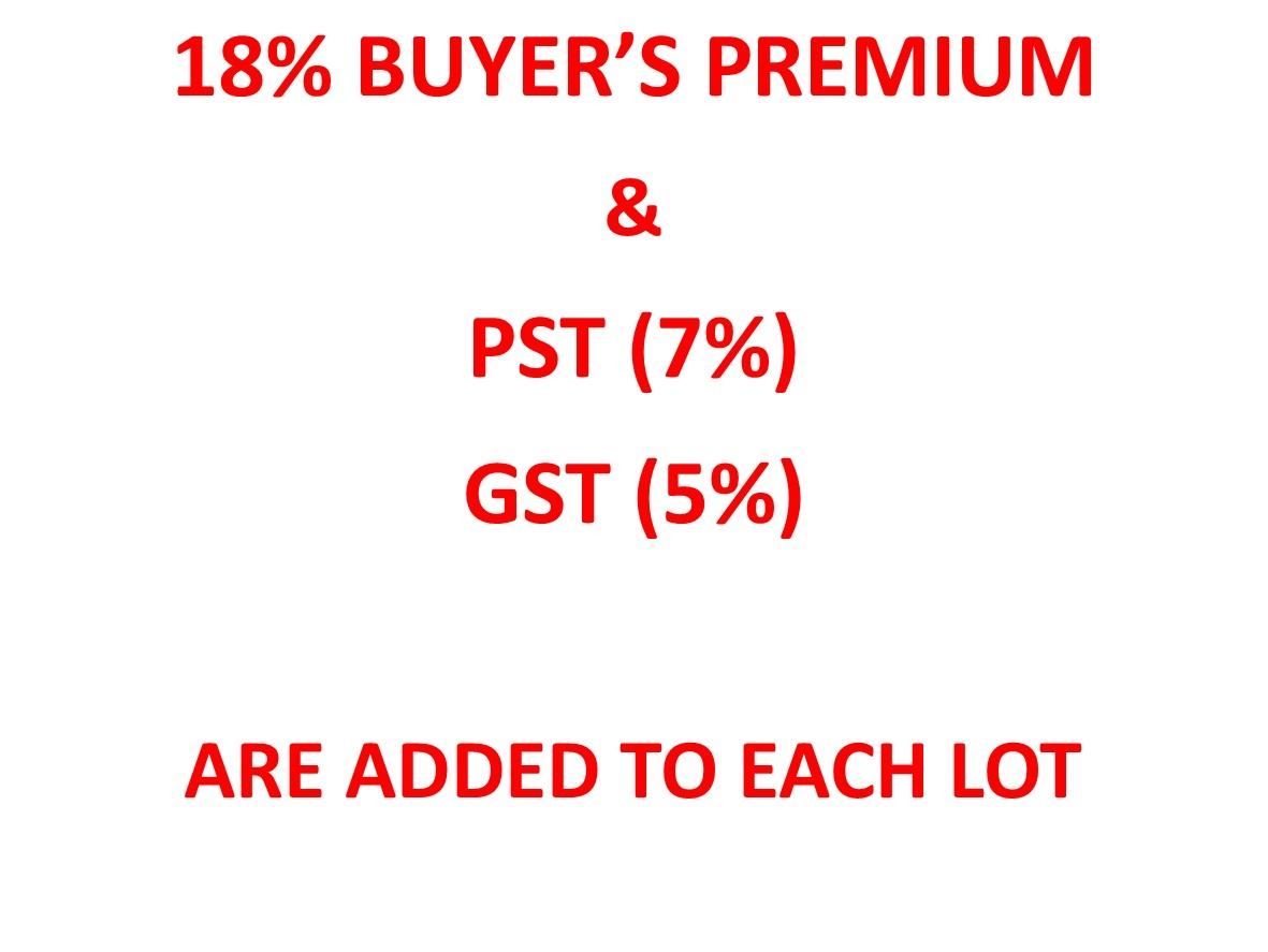 Shipping will be via Canada Post including insurance (unless advised otherwise) at the rate of $2.25/$100 and costs will be determined after the auction and charged to the credit card registered with Live Auction World.