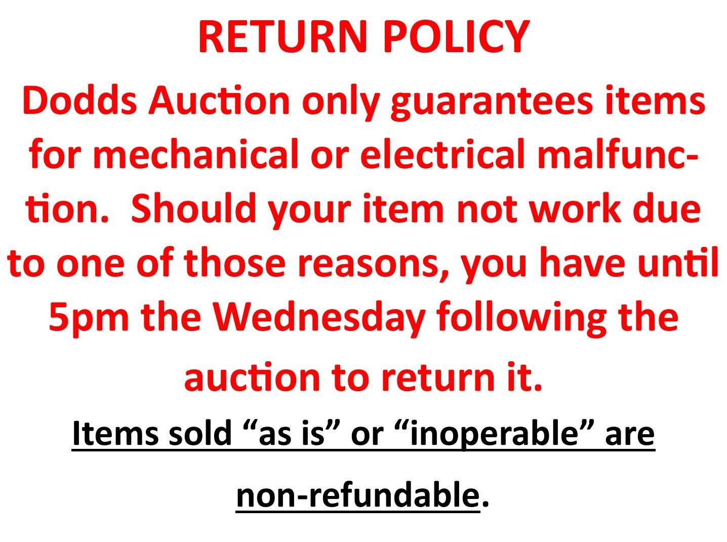 RETURN POLICY: Limited guarantee ONLY (if electrical/mechanical items are not working) valid until 5 pm, Wednesday, May 10/23 No returns on "As Is" OR "Inoperable" items.