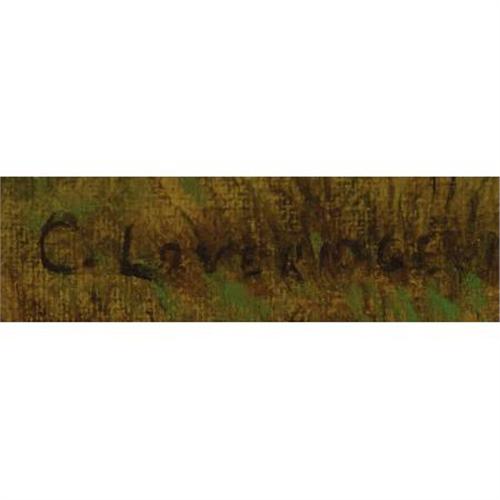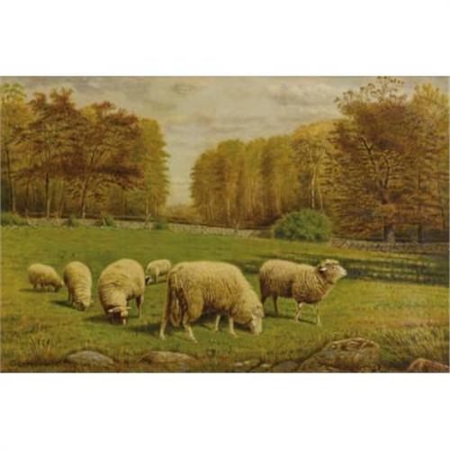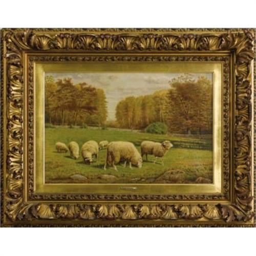 <B>CLINTON LOVERIDGE </B></I>(American 1824-1902)<BR><I>Grazing Sheep</B></I>, circa 1875<BR>Oil on canvas<BR>16 x 24 inches (40.6 x 61.0 cm)<BR>Signed lower left: <I>C. Loveridge</B></I><BR> <B>Condition Report:</B> Original, unlined canvas. Has been cleaned with minor areas of strengthening.<BR><BR><b>Shipping:</b> Requires 3rd Party Shipping (<a target="_blank" href="http://www.heritageauctions.com/common/shipping.php">view shipping information</a>
