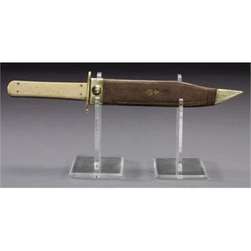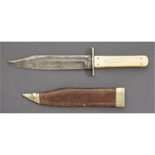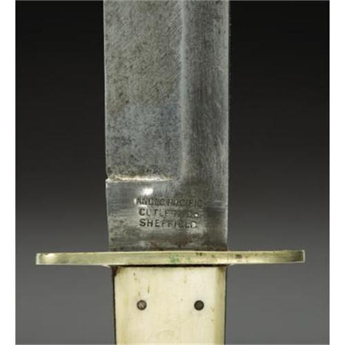 <B>CLIP POINT BOWIE KNIFE WITH SHEATH BY THE ANGLO PACIFIC CUTLERY COMPANY, SHEFFIELD</B></I>. bone grip scales are secured to the tapered tang by four steel pins. The knife is German silver mounted, and measures an overall length of 10¼ inches, the blade is 6¼ inches, and the clip point 2 inches. Thickness at ricasso is 7/32. The sheath is German silver mounted pigskin with gold embossed decoration.<BR><B><BR>CONDITION: </B></I>The blade is cleaned and sharpened and is a smooth gray color with some very light scattered pitting and stains. The grip scales retain a mellow patina. The sheath has minor scuffing to the leather, and the German silver tip has some staining.<BR><BR><b>Shipping:</b> Bats, Clubs, Sticks, Swords, Rif (<a target="_blank" href="http://www.heritageauctions.com/common/shipping.php">view shipping information</a>)