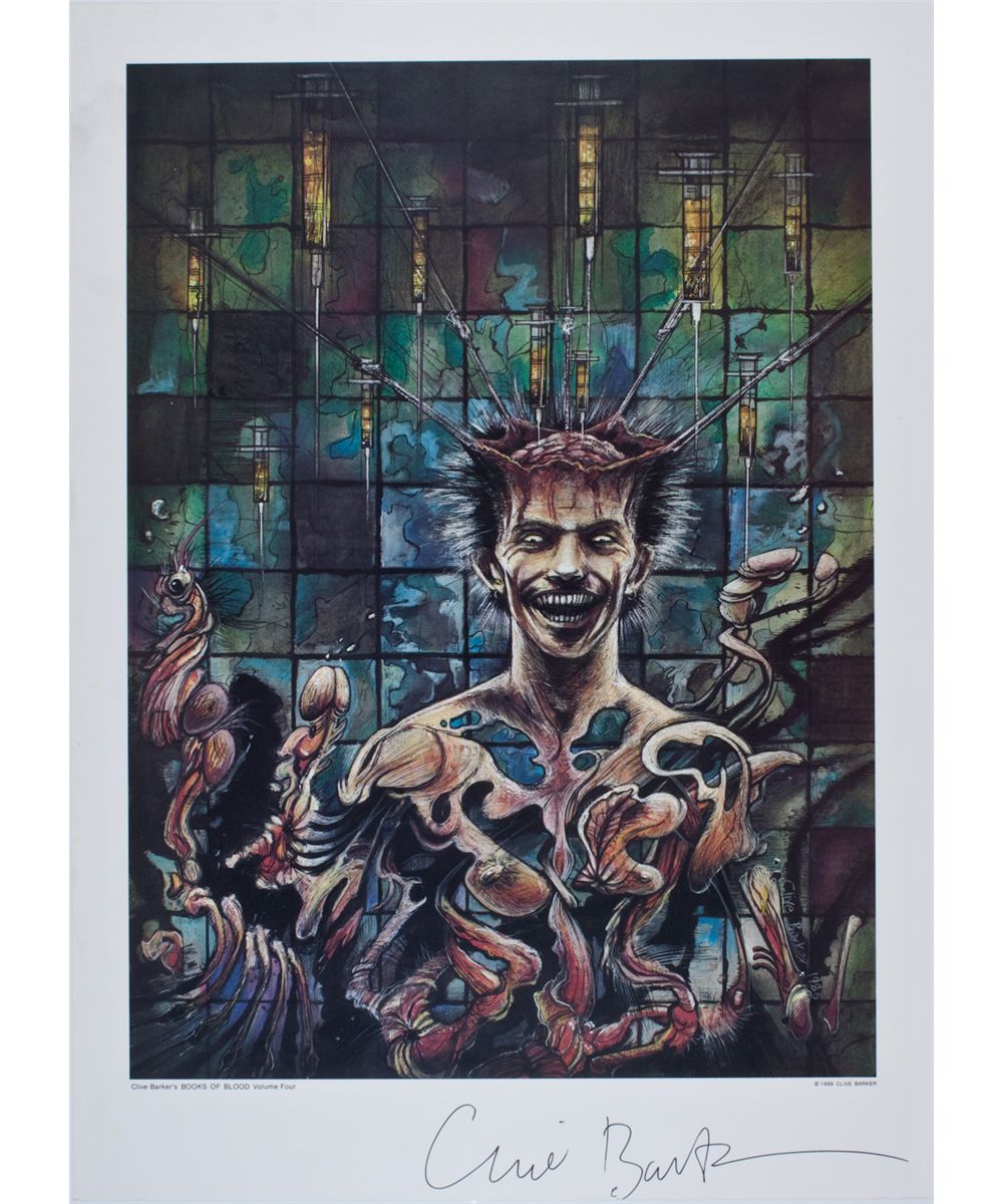 (b. 1952) English author and artist known for his fantasy and horror images as well as fictional works that become the basis for the durable horror films Candyman and Hellraiser. A poster measuring 14" x 20", showing one of Barker's paintings of a man with exploding brain for "Books of Blood", 1988, boldly signed. Very good condition.