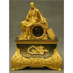 BORDSUR, FÖRGYLLD OCH GRÖNPATINERAD BRONS, UNDERDEL MED BLADDEKOR I RELIEF, OVANDEL MED FÖRFATTAREN SIR WALTER SCOTT SITTANDE PÅ URHUSET, SENEMPIR C. 1840, H45, B35