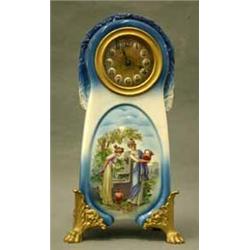 BORDSUR, GOLVURSMODELL, PORLSIN, TASSFÖTTER I BRONSERAD METALL, DEKOR AV KVINNOR VID BRUNN, TURKOS GRUND, C. 1900, H41