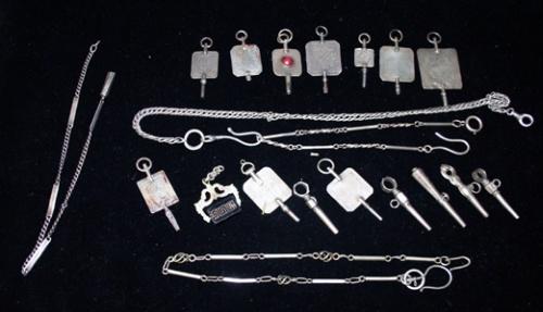 15 KLOCKNYCKLAR, 3 KLOCKKEDJOR, SILVER 1800-TAL (NÅGRA DEFEKTA)