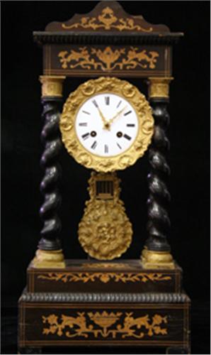 BORDSPENDYL, VALNÖT MED INTARSIA AV FRUKTTRÄ, PENDEL OCH ORNAMENT AV MÄSSING, SENEMPIR C. 1860, H52, B25