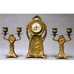 KLOCKGARNITYR, BORDSUR, 2 KANDELABRAR, MÄSSING, UR MED DEKOR AV KVINNOFIGUR OCH JUGENDSLINGA, TVÅARMADE KANDELABRAR, DEKOR AV FLICKA OCH JUGENDBLOMMOR, URTAVLA SIGN. F HELLSTRÖM, STOCKHOLM, UR H28, B13, KANDELABER H20