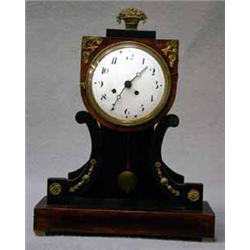 BORDSPENDYL, BJÖRK, REKTANGULÄR FOTPLATTA, URHUS UPPBURET AV SVÄNGDA PELARE, EMALJERAD URTAVLA, DEKOR AV MÄSSINGSORNAMENT, TYSKLAND/ÖSTERRIKE, EMPIR TIDIGT 1800-TAL, H38, B29