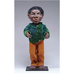 CLOCKWORK BLACK NODDER. A full-figured cloth-dressed black gentleman with exaggerated features. When wound, his head nods to and fro; also causing his eyes to roll up into his head. SIZE: Base is approx 8”w x 8”d standing 24” h. CONDITION: Re-dressed and restoration to head and hands. JL 1-2794