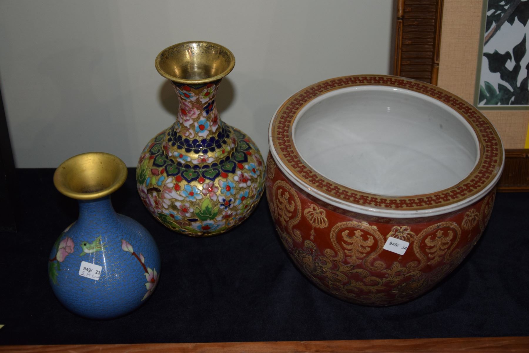 CLOISONNE CHINESE VASES (2) & CHINESE CERAMIC PLANTER (3 PCS)