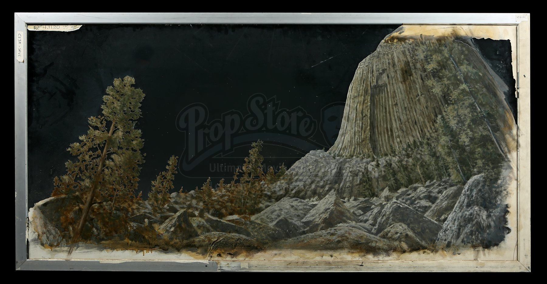 The painting is achieved using acrylic paints on a large glass panel and depicts a tree-lined rocky base at the foot of Devil’s Tower. Written on a strip of tape at the top left corner of the glass are “R2-4,11, 20” and “FRONT FOCUS”. The glass artwork is housed in an aluminium frame and shows minor wear to the metal due to production use and age. The piece was recently cleaned and given an extremely minimal touch-up by assistant matte artist Rocco Gioffre. It remains in fine condition. Dimensions: 183 cm x 96.5 cm x 1.5 cm (72” x 38” x ½”)