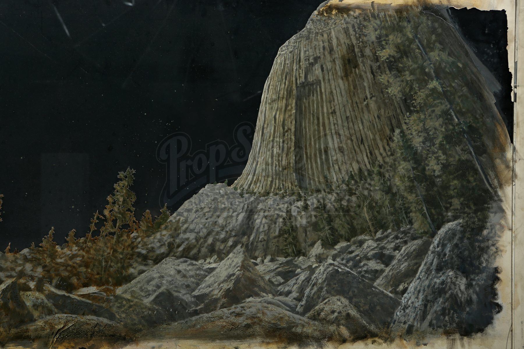 A glass matte painting by Matthew Yuricich from the production of Steven Spielberg’s sci-fi classic Close Encounters of the Third Kind. Matte painting is one of cinema’s oldest visual-effects techniques, used to extend sets and create scenery for films by means of a painted image rather than a physical set. Unseen in the final film, this matte painting shows the Devil’s Tower rock formation from a low angle.