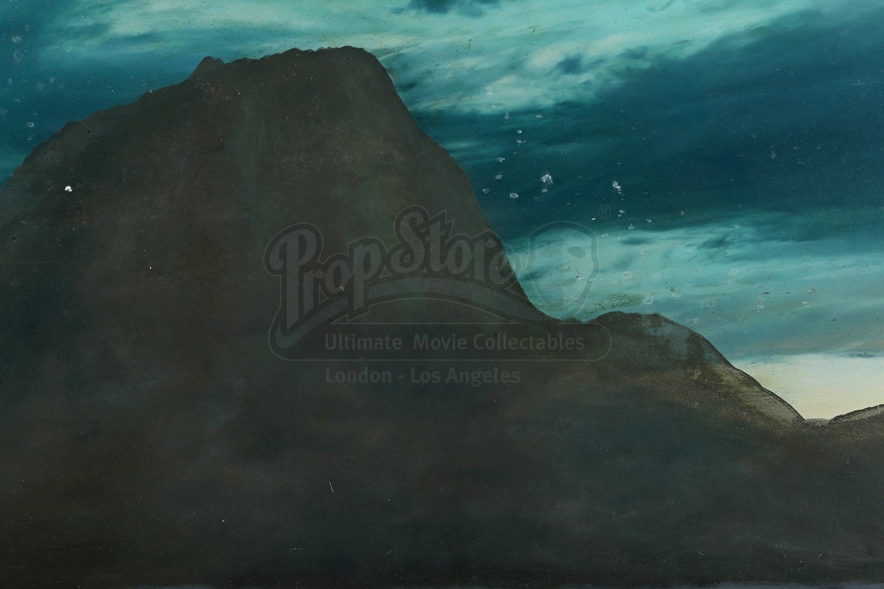 The painting is achieved using acrylic paints on a large sheet of masonite, and shows a deep blue sky with swirling clouds. A large area is painted grey, where the live-action footage of Devil’s Tower would overlap. A tree is painted on the left side of this massive rock formation. Written at the top left corner of the board is “CN-24”. The artwork shows minor wear to the masonite due to production use and age. The piece was recently cleaned and given an extremely minimal touch-up by assistant matte artist Rocco Gioffre. It remains in fine condition. Dimensions: 203 cm x 96.5 cm x 0.5 cm (80” x 38” x ¼”)