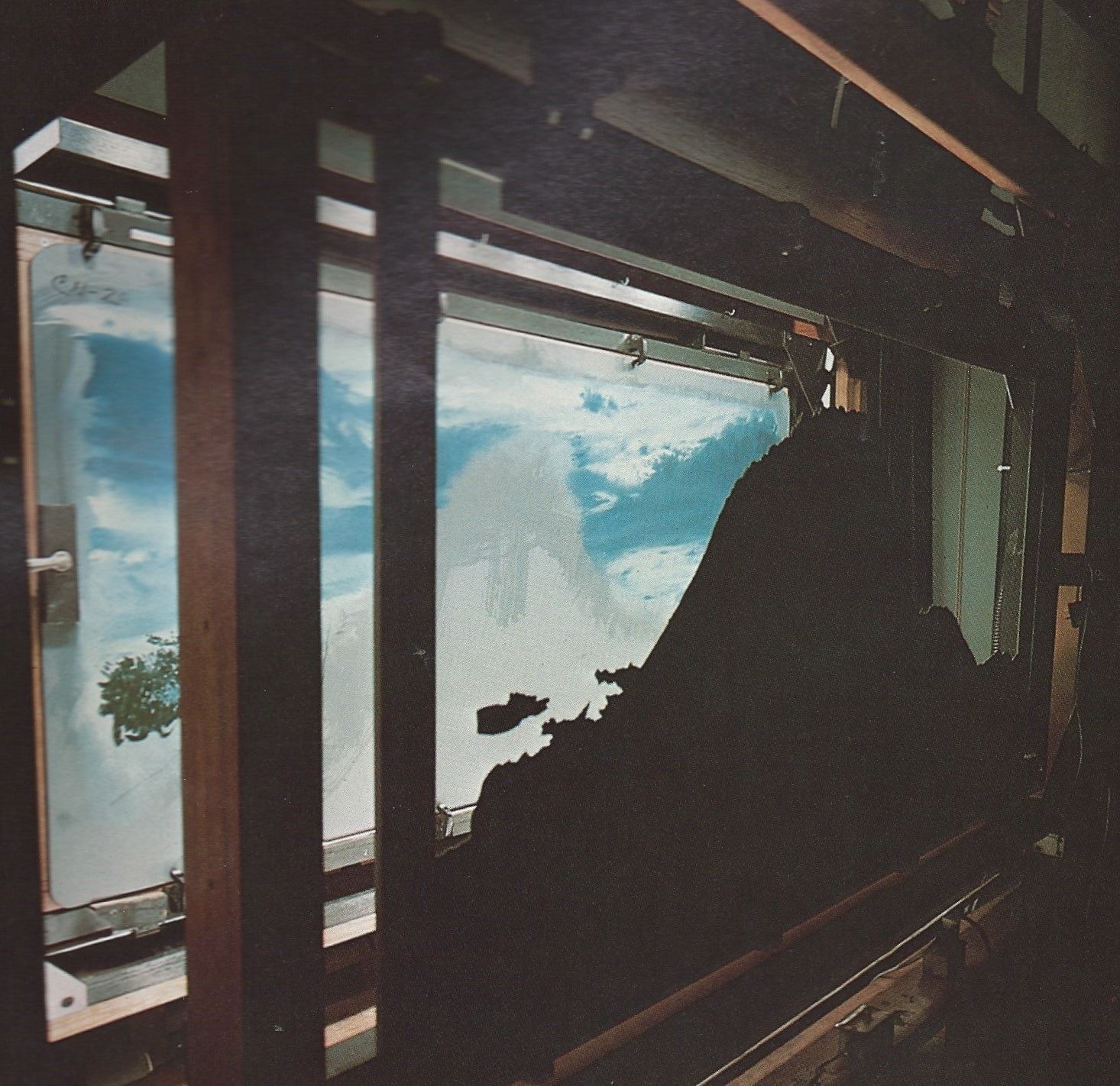 A matte painting by Matthew Yuricich from Steven Spielberg’s sci-fi classic Close Encounters of the Third Kind. Matte painting is one of cinema’s oldest visual-effects techniques, used to extend sets and create scenery for films by means of a painted image rather than a physical set. This matte painting was used to create a remarkable cloud formation in the sky behind Devil’s Tower for the scene in which the clouds took on an otherworldly appearance as the Mothership arrived.