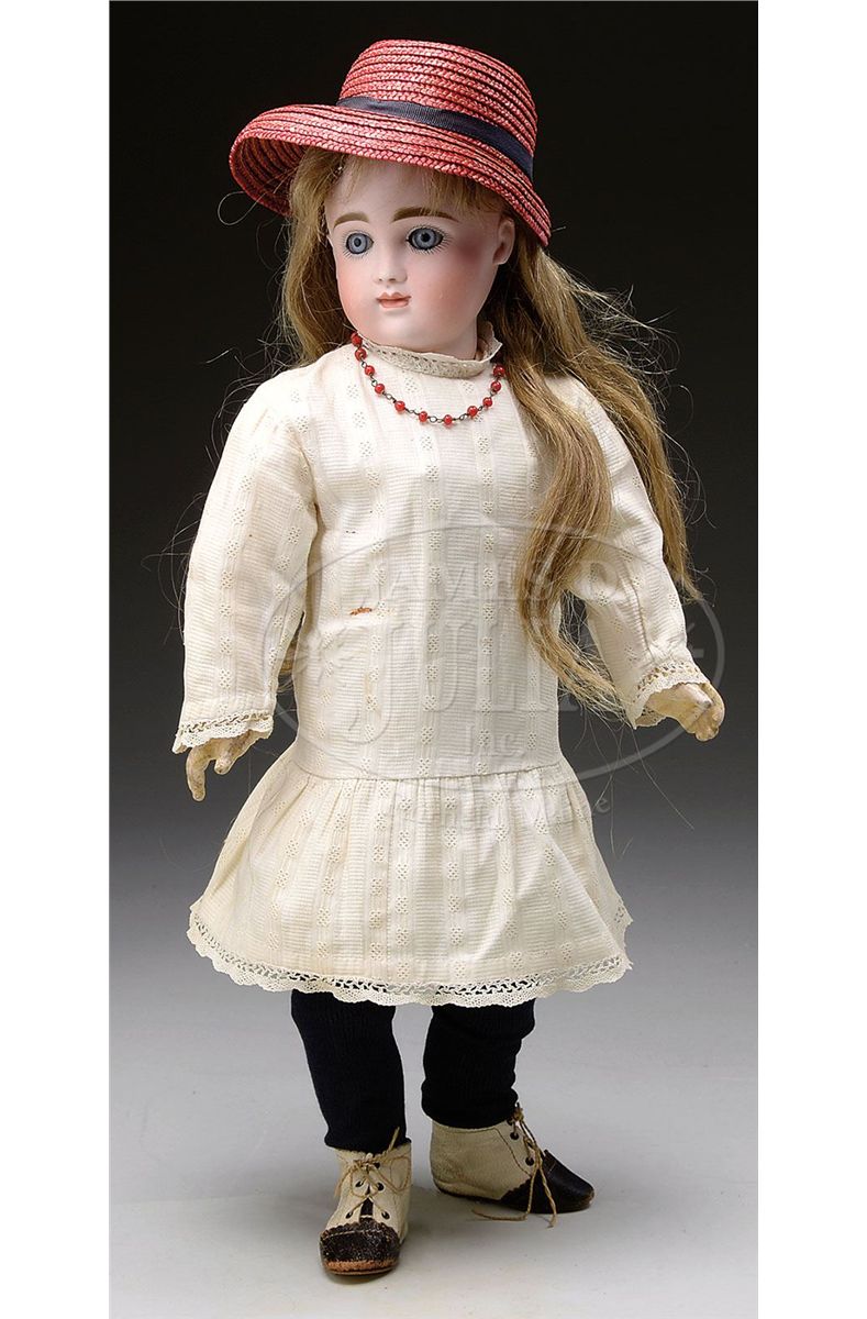 Bisque socket head incised "IX" with blue glass sleep eyes, thick multi-stroke eyebrows and finely painted upper and lower lashes, closed mouth with well defined protruding upper lip. On the original early wood and composition body with straight wrists and separate ball joints at the shoulders, elbows, and knees. Clothing is made of all antique fabrics. Wig is dark blonde human hair (needs attention) and the shoes are black and white leather with cardboard soles. SIZE: 18" (46 cm). CONDITION: Body retains original finish. Head good other than a tiny old eye chip repair on left lower eye rim. Minimal scuff to each cheek. 1-13303