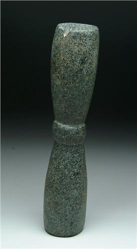 CLOUD TYPE BLOWER PIPE. Black steatite. Late Archaic to early Woodland, Circa 1000BC style-500AD style. SIZE: 10-1/2in. l x 2-1/2in. w. CONDITION: Slight damage on lip of bowl, otherwise very good. 9-25984-37 The Tennessee Collection of Prehistoric Indian Artifacts from the Allen Graves Estate. SPECIAL NOTE: We do not regularly sell Prehistoric Indian stone artifacts and therefore have very little experience and no expertise in this area. All of the following lots have come from the Collection of the Late Allen Graves of Tennessee. The collection was inherited some years back by his daughter, who now lives in Maine. This collection was consigned to us directly from her. We employed someone to generally identify styles and types, but as stated above, due to our lack of expertise in this field, we can not guarantee the age or origin of the following pieces. We are relying on you, the buyer, to determine to your satisfaction the origin and age of each item in the collection.